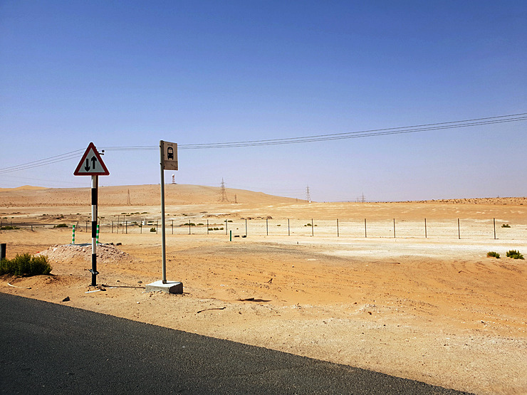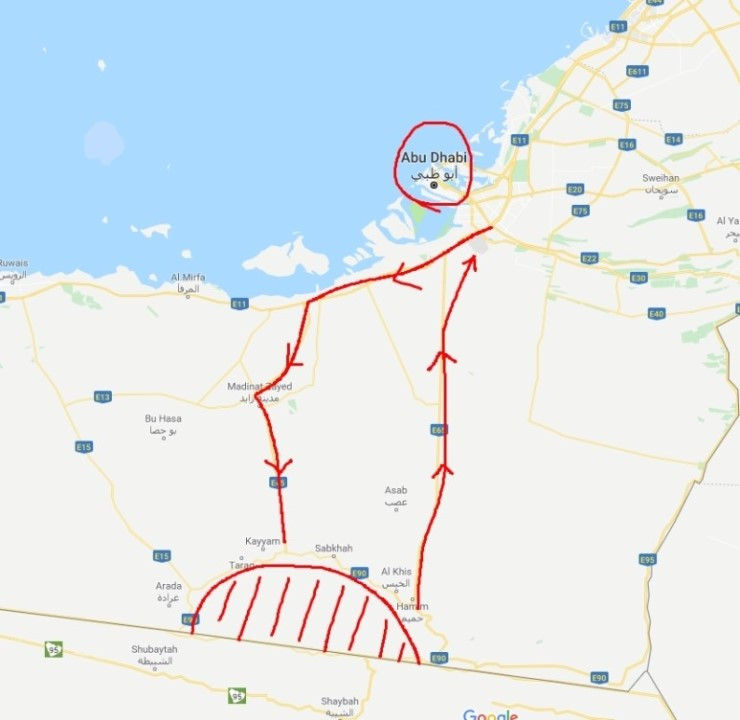 아부다비에서 가는 길과 오는 길을 화살표로 표시했다. 아부다비 공항에서 E11번 고속도로를 타고 서쪽으로 100킬로미터쯤 가다가 좌회전하여 E45번 도로를 타고 남쪽으로 쭉 내려오면 리와 사막이 나온다. 아부다비에서 리와 까지는 약 250km. 약 2시간 30분 정도가 소요된다. E11번 고속도로는 편도 4-5차선 도로이고 아부다비에서 카타르와 사우디를 잇는 주요 도로이기 때문에 이른 아침부터 차량통행이 많았다. 최고 시속이 120km/h인데, 아랍에미리트에는 좋은 차들이 워낙 많아서 시속 150-200 정도로 내달리는 차량들이 흔하게 보인다. 나는 3차선에서 시속 100 정도의 속도로 느긋하게 운전했다. E45번 도로에 들어서면 편도 2차선 도로가 나오는데, 이때부터는 차량이 거의 없다. 계속해서 지평선이 보일 정도로 수 킬로미터 도로가 쫙 뚫려있는데 우리 차 앞뒤로 차량이 한대도 보이지 않았던 경우도 많았다.