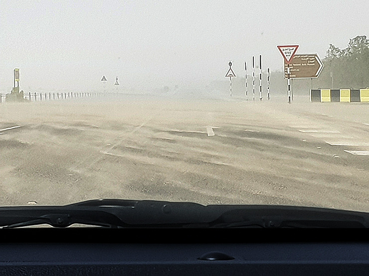 모래폭풍으로 앞이 보이지 않을 정도였는데, 이쪽 모래가 도로를 건너서 저쪽으로 이동했다.