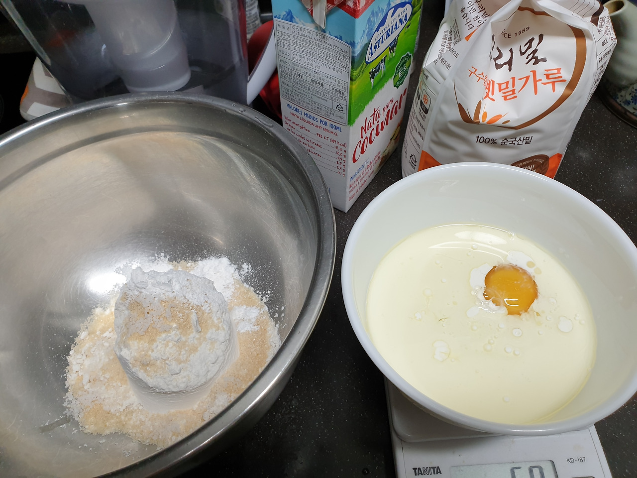재료 : 박력분 (중력분도 괜찮다.), 생크림(우유로 해도 된다.), 베이킹파우더(소다 아님), 소금과 설탕