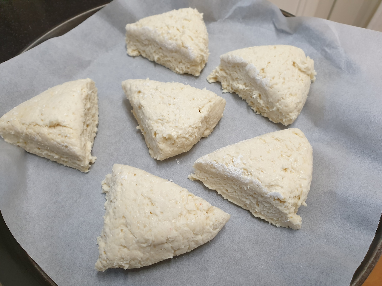 손님 온 날 음식 망친다고, 맘먹고 사진 찍으면서 했더니 저 모양이다. 오죽하면 자르는 칼에 밀가루를 다 묻혀서 잘랐다. 비닐에서 똑 떨어지지 않아서 겉도 매끈하지 못하지만, 어쨌든 이러나저러나 스콘이 된다는 건 알고 있다.
