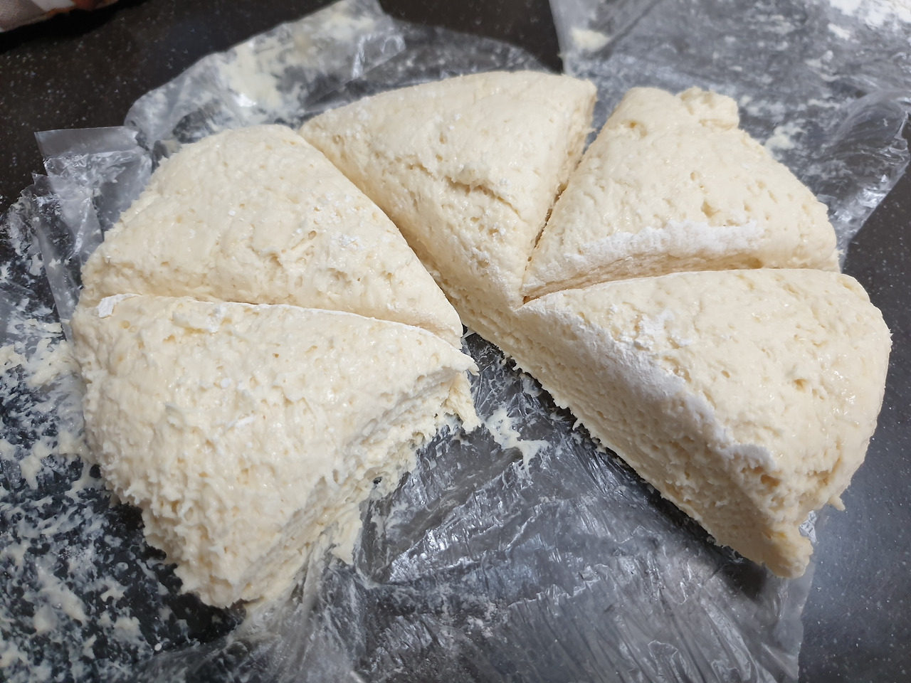 어쩐 일인지 반죽이 몹시 질지만 무시하고 비닐 위에서 대충 6등분을 하고, 오븐팬에 종이호일을 깔고 올려놨다.