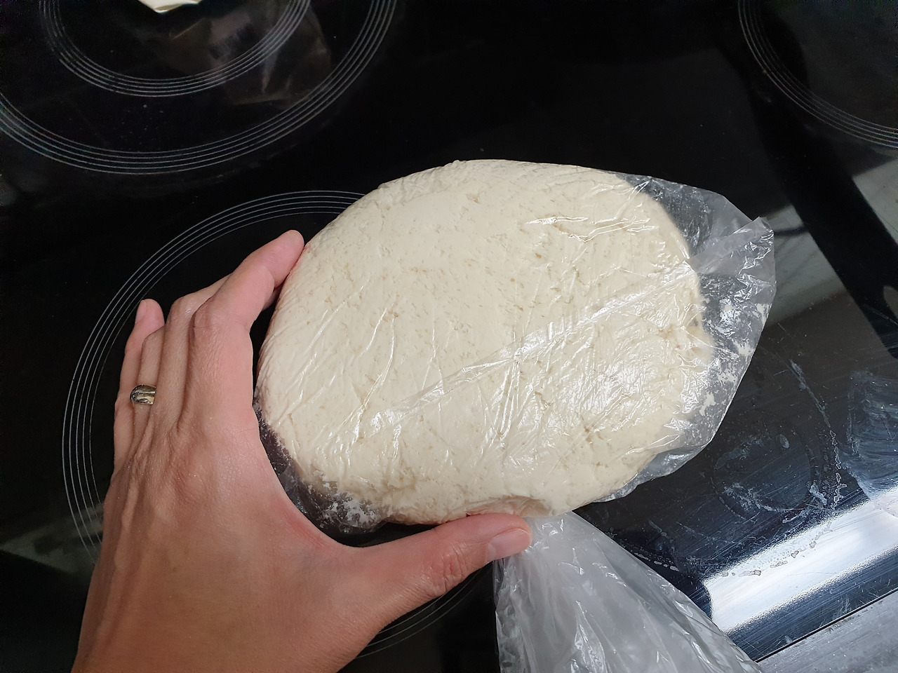 비닐에 반죽을 넣고 대충 두드려서 모양을 잡아준다. 높이가 2센티쯤? 냉장고에서 30분쯤 둔다. 전날 밤에 이렇게 만들어 두면 아침이 더 가뿐하다. 30분 후에 꺼낸 반죽.