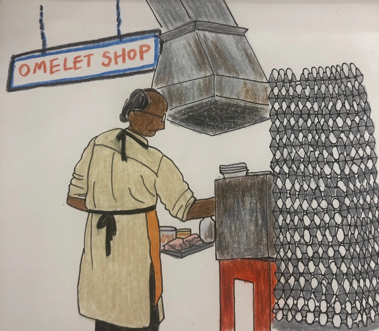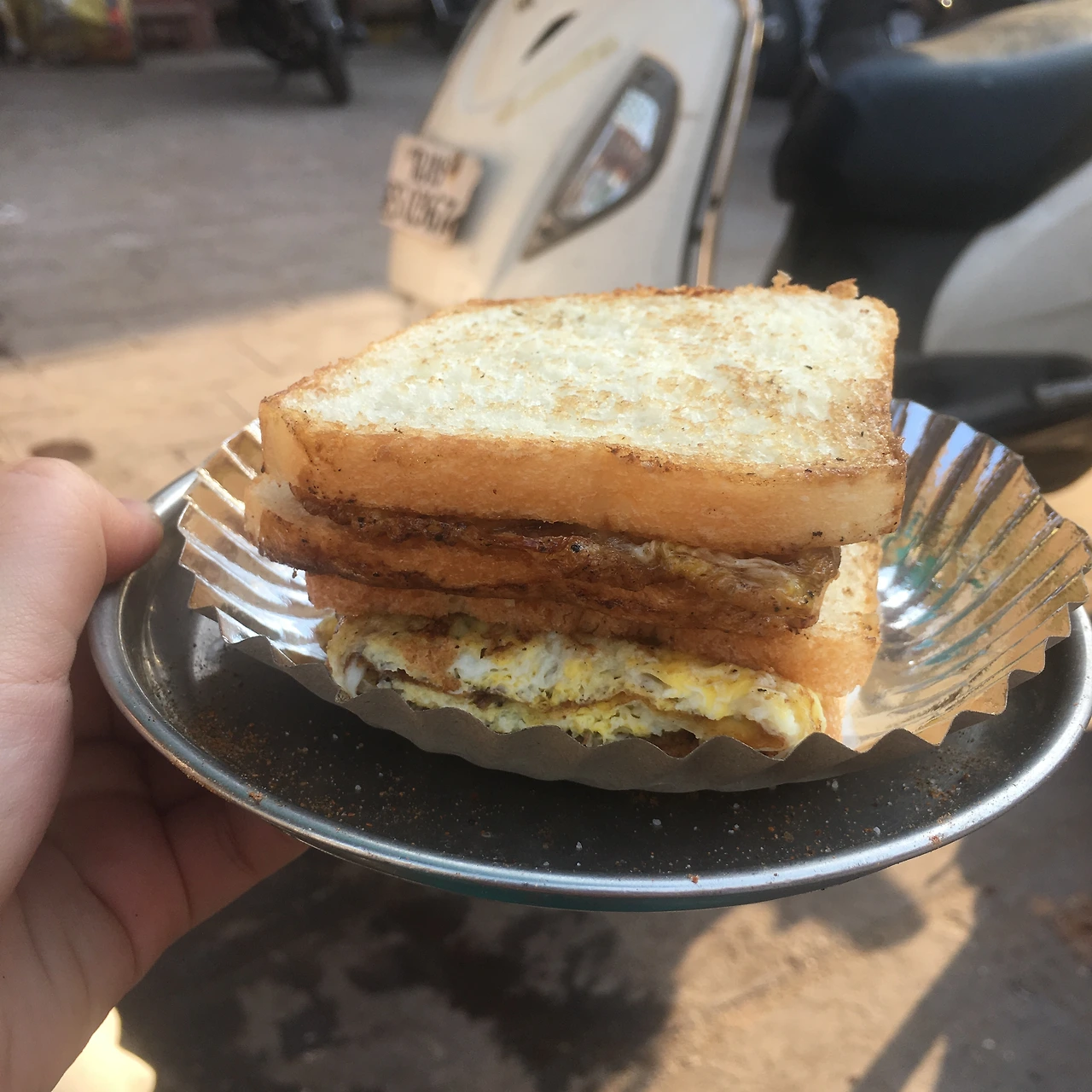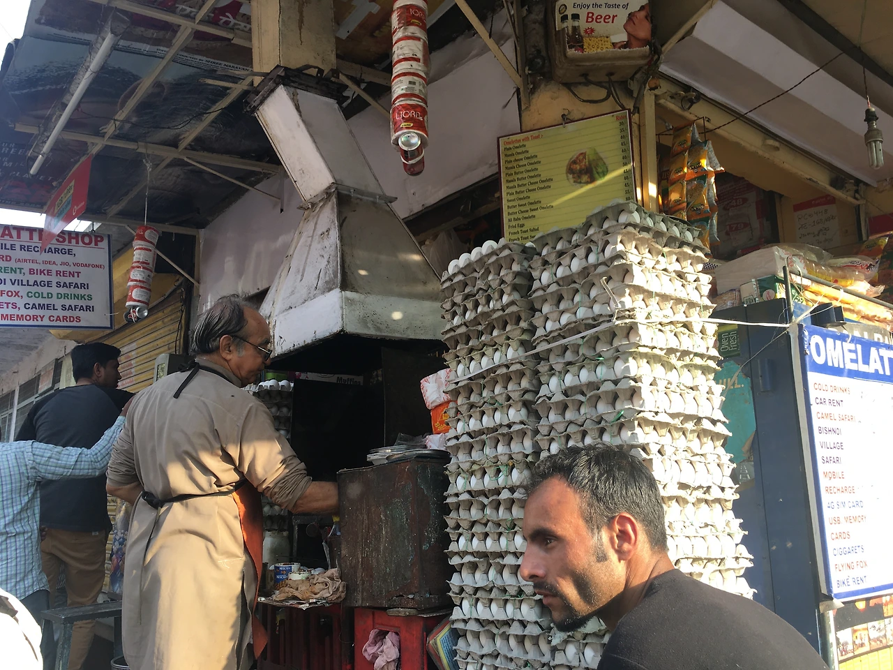조드푸르엔 꼭 가봐야 하는 것으로 알려진 오믈렛숍이 있다. 영화 '김종욱찾기'를 촬영할 당시 배우 공유가 먹은 이후 한국인들 사이에서 엄청나게 유명해졌다고. 그런데 그 덕에 잘 되는 가게가 사실 공유가 찾은 곳이 아닌데 잘못 알려졌단 말도 있더라. 아무튼, 이곳의 요리사님은 나이가 지긋하시다. 손님들을 등지시고 쉴 새 없이 오믈렛을 만드시는데, 포스가 보통 장인 느낌이 아니다. 바로 옆에서 가벼운 말투로 활발하게 손님을 맞이하는 직원분과는 사뭇 다른 진중함이 느껴진다. 그 옆의 계란탑의 위용은 또 어떤지. 저 정도 높이까지 쌓여있는 계란판은 아마 앞으로도 못 볼 광경이지 싶었다. 꾸질하게 기름때가 잔뜩 낀 기름통과 받침대, 소스통. 그리고 주인분께서 수없는 오믈렛을 만드시는 프라이팬. 며칠 일찍 도착해 먼저 오믈렛을 맛본 동행들은 요리 과정이 궁금하더라도 절대 그 프라이팬을 들여다보지 말라며 손사래를 쳤다. 속이 시꺼먼 그것(!)을 보았다간 주문한 오믈렛을 먹지 못할 수도 있다면서 단단히 경고 아닌 경고를 하더랬다. 뭐 어쩔 수 없다. 이곳은 인도인걸! 덕분에 보진 않았지만 마치 본 것과 다름없는 마음가짐으로, 오믈렛을 영접했다.