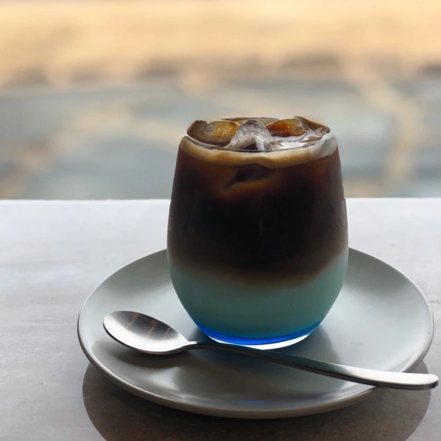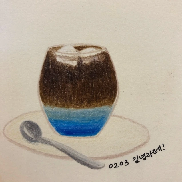 매니저님께서 커피 마시지 않겠냐 하셔서 아이스 라떼를 부탁드렸다. 난 언제나 곧 죽어도 아이스! 그 중에서도 라떼를 정말 좋아한다. 그리고서 건네받은 커피는 일명 '김녕라떼'. 블루 큐라소 시럽을 이용해 바다색을 내는 이 라떼는 김녕의 어느 카페에서 '김녕라떼'라는 이름으로 판매하면서 유명해졌다. 이제는 김녕라떼를 시작한 카페를 모르는 사람은 많아도 이 파란 라떼가 김녕라떼라는 사실을 모르는 사람은 거의 없는 듯하다. 조금만 커피와 카페투어에 관심있는 사람이라면 아마 다 아는 것 같은, 김녕바다를 닮은 이 라떼는 마실 땐 커피와 시럽을 모조리 섞어야 한다. 그런데 맑디맑은 파란색이 커피와 섞이면 거무죽죽한 녹색을 띈다. 그래서 붙여진 또다른 별명이 바로 '녹조라떼'다. 섞기 전엔 세상 예쁜 비주얼인데 막상 먹기 위해 섞으면 못생겨진다니! 같은 커피잔에 김녕앞바다와 녹조가 함께 담긴다는 건 참 재밌다. 먹기 전에 열심히 인스타용 사진을 찍고 휘휘 저어 마신다는, 두 가지 빛깔, 두 얼굴의 김녕라떼. 맛은 달달하니 녹조라떼란 별명이 안타까운 맛이다.