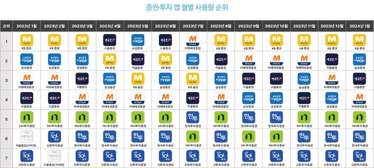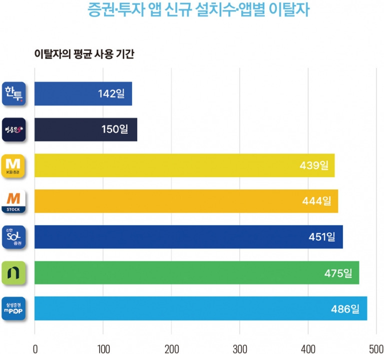 여기까지는 나의 개인적인 사용성에 대한 견해이고, 좀 객관적인 자료를 보고 싶어서 포브스 코리아에 실린 2023년 1월부터 2024년 1월까지의 자료를 좀 살펴보았다. 나는 사용성을 확인하기 위해서니까 봐야 할 지표는 '이탈자'항목이다. 이탈자의 평균 사용기간이 150일 이하인 '한투'와 '영웅문'은 사용성이 안 좋다는 것이 객관화된 것 같아 내 리스트에서 제외해 버렸다.