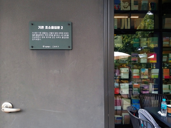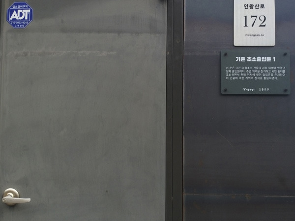 건물 주위를 한 바퀴 천천히 돌아본다. 그 흔적들이 곳곳에 있다. 시멘트 벽돌로 지어졌던 건물의 외벽을 철거하면서 벽체의 일부를 지하 계단의 난간으로 활용하거나 동측 외벽과 서측 외벽의 철제 출입문을 그대로 둠으로써 시민의 쉼터가 된 책방에 기존 초소에 대한 기억의 장치를 남겼다.