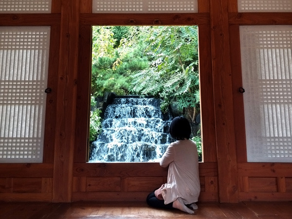 아! 그건 청운낙수淸(靑)雲落水였다. 정자에 앉아 있던 이의 '와!' 하는 짧은 외마디를 듣고 몰려든 사람들의 옹기종기 감탄 어린 시선이 반듯하게 잘린 창틀을 너머 물의 낙하로 향하고 있다. 혼자 배회하고 있던 나 역시 그 틈에 껴서 푸른 나무 아래 아담한 하얀 폭포를 하염없이 바라보는데 날씬한 멋쟁이 아가씨가 살며시 말을 걸어온다.