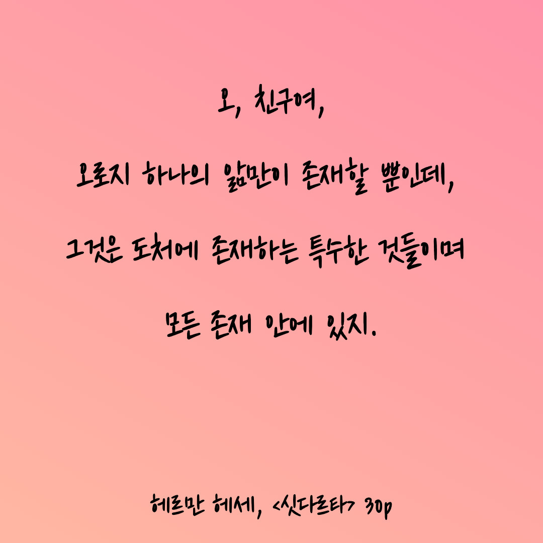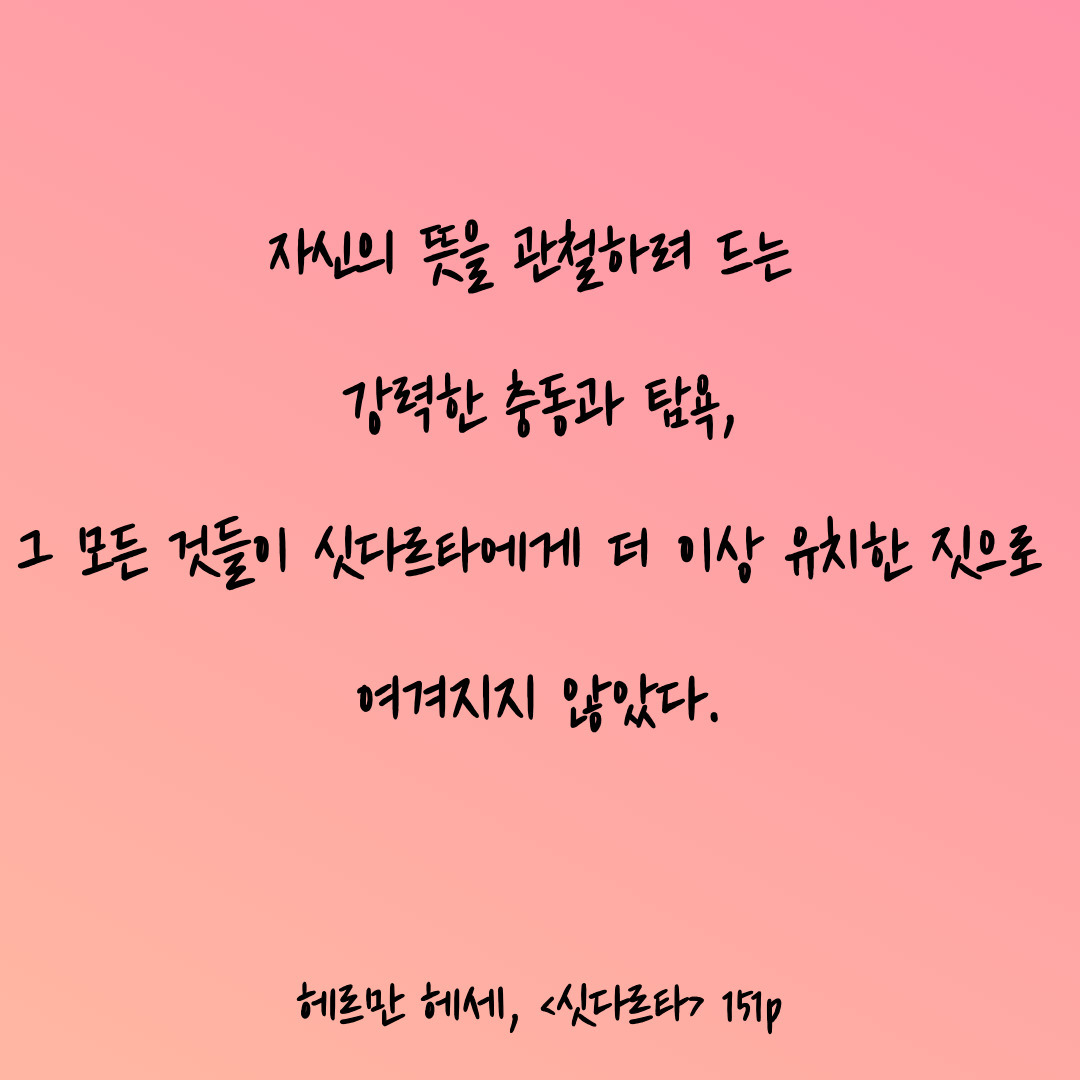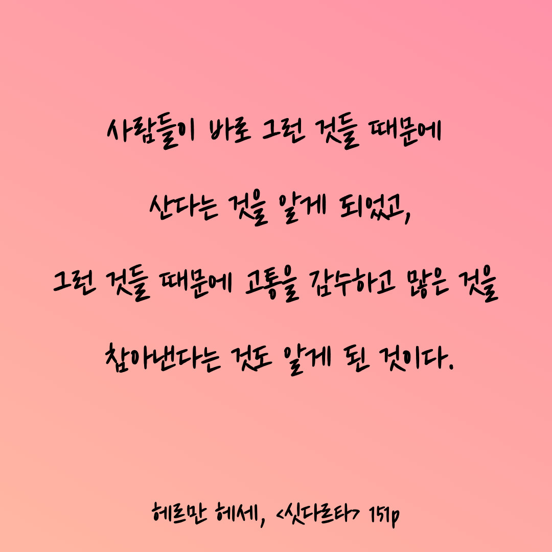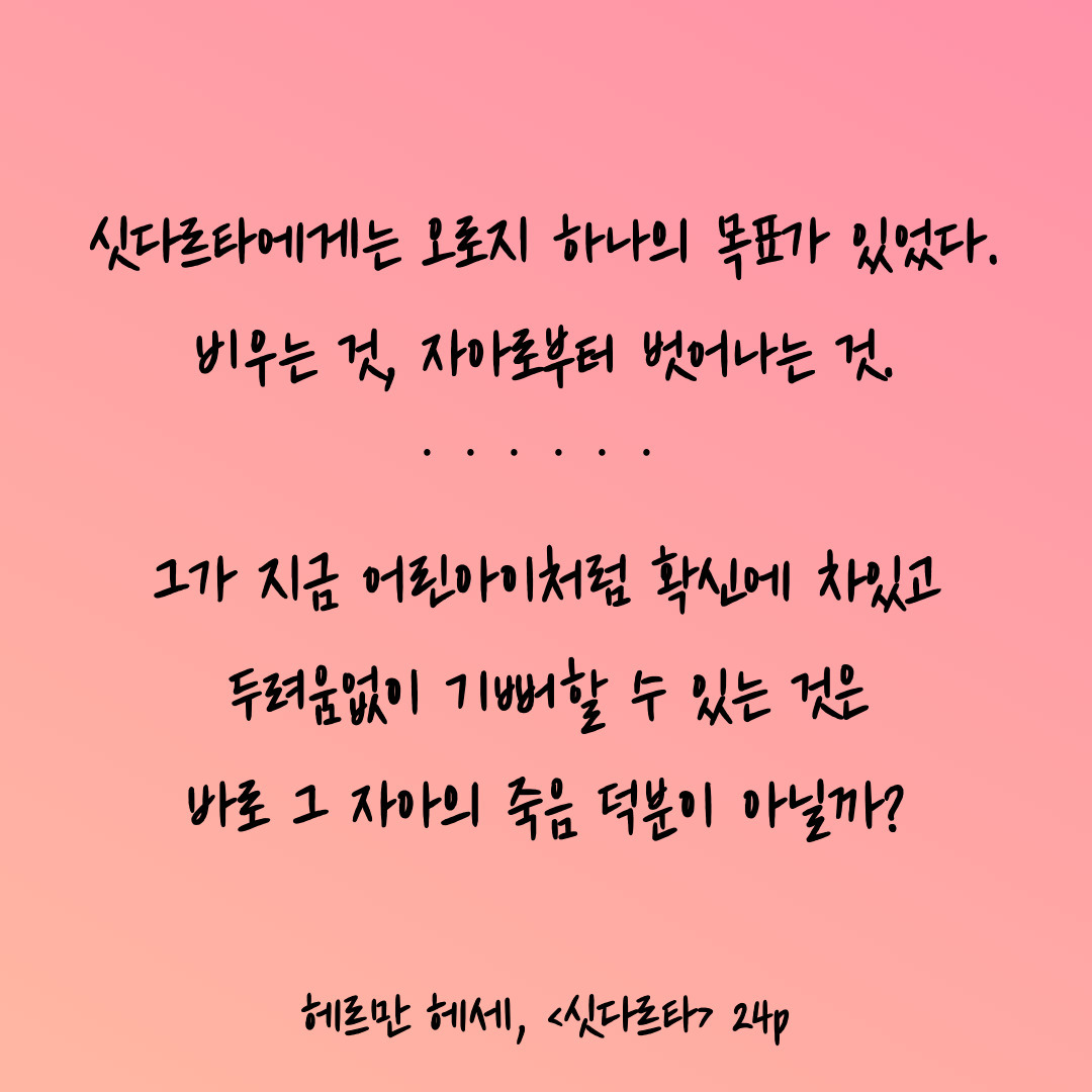 '싯다르타'는 잘 알려지지 않은 작품인지만, 데미안에 견주어 뒤지지 않을 만큼 큰 울림을 주는 명작이다.
