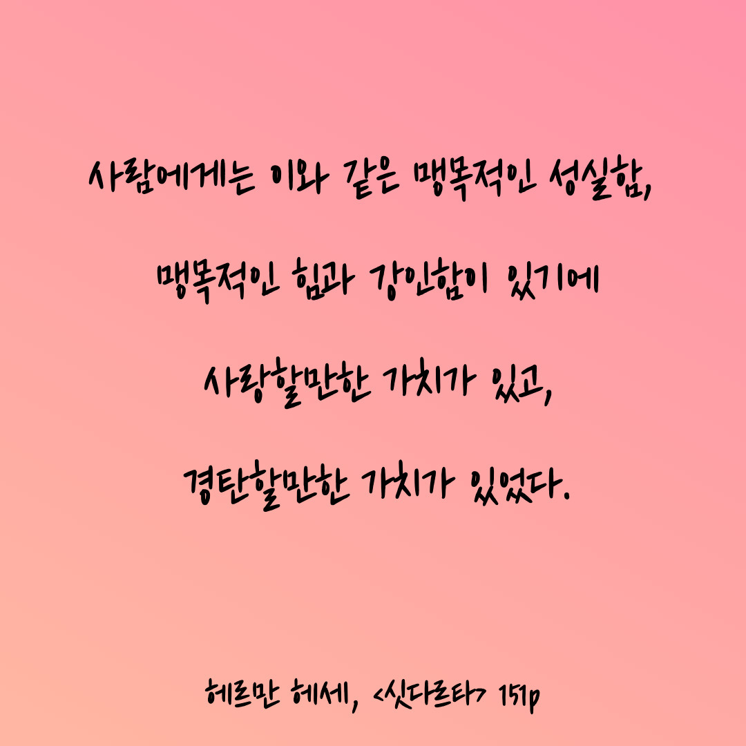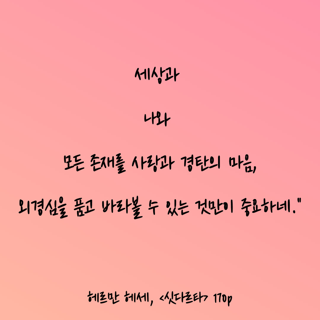 선과 악에 따라 가치판단을 하는 우리의 입장에서는 싯다르타의, 헤르만 헤세의 메시지가 낯설게 느껴질 수도 있다. 물론 헤르만 헤세가 살인, 강도 등 범죄까지도 옹호하지는 않았을 것이다. 하지만 모든 사람과 존재가 가진 맹목적인 삶에의 의지, 생명력을 느낄 수 있다면 우리가 살면서 느끼는 모든 것들을 참아낼 수 있다는 생각이 든다. 그리하여 헤세의 글을 통해 우리가 어느 정도 '도덕적인 잣대에서 벗어나 다른 사람과 현상을 있는 그대로 인정하고 바라볼 때, 세상의 모든 면을 긍정할 때 우리의 번민과 고뇌가 사라질 수 있으리라 생각한다.