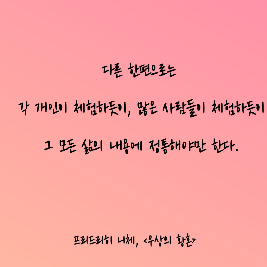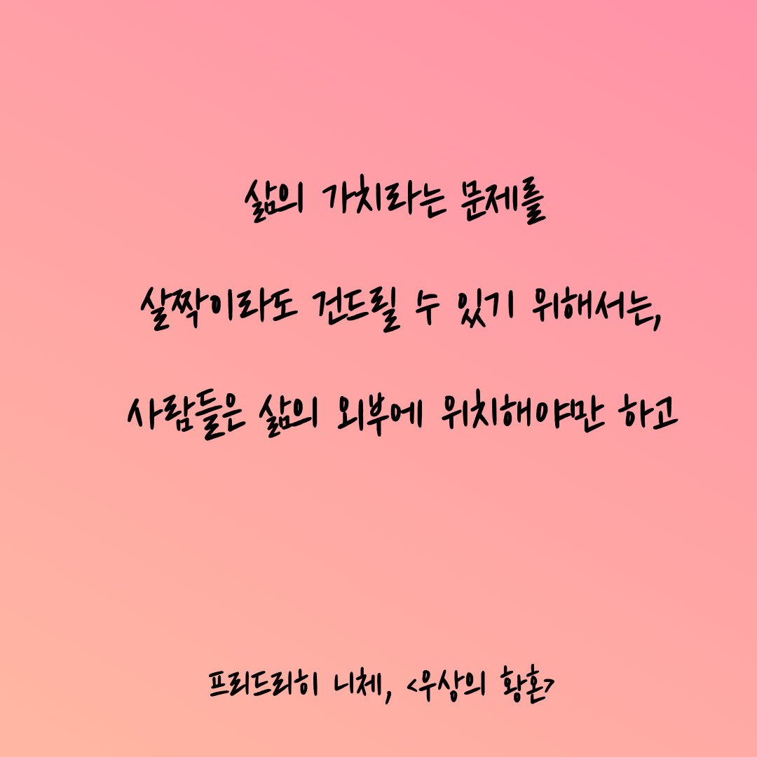 니체가 말하듯 우리가 어떤 것의 가치를 평가하기 위해서는 한발 뒤로 물러서서 그 삶의 외부에 있어야 한다.