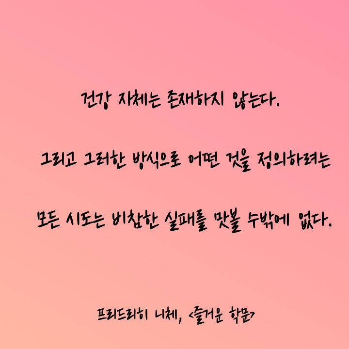 니체의 말처럼 '건강'은 정의할 수없다. 모든 사람에 따라 건강에 대한 정의가 다르다. 이 말은 니체가 평생 동안 느끼던 병을 극복하고자 했던 정신 승리로 볼 수도 있다. 하지만 진지하게 생각해 보자. 육체적, 정신적으로 건강하다는 것은 무엇인가? 단순히 아픈 곳이 없다는 것이 건강하다는 것일까?