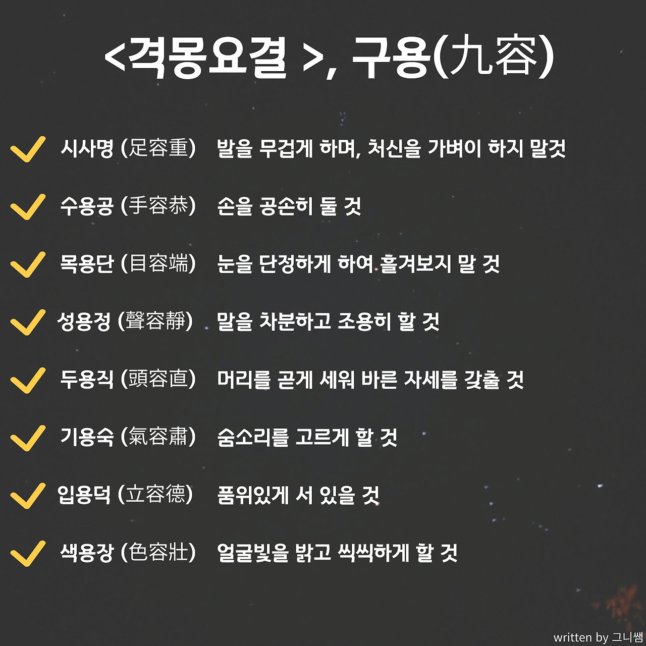 격몽요결은 처음부터 끝까지 자기 자신이 중심을 잡을 수 있어야 함을 강조한다. 지신과 혁구습이 마음의 중심을 잡는 것이라면, 몸가짐 장은 올바른 몸가짐과 생각의 중심을 잡는 것이다. 올바른 몸가짐을 가지는 9가지 방법이 '구용'이고 올바른 생각의 9가지 방향이 '구사'다.