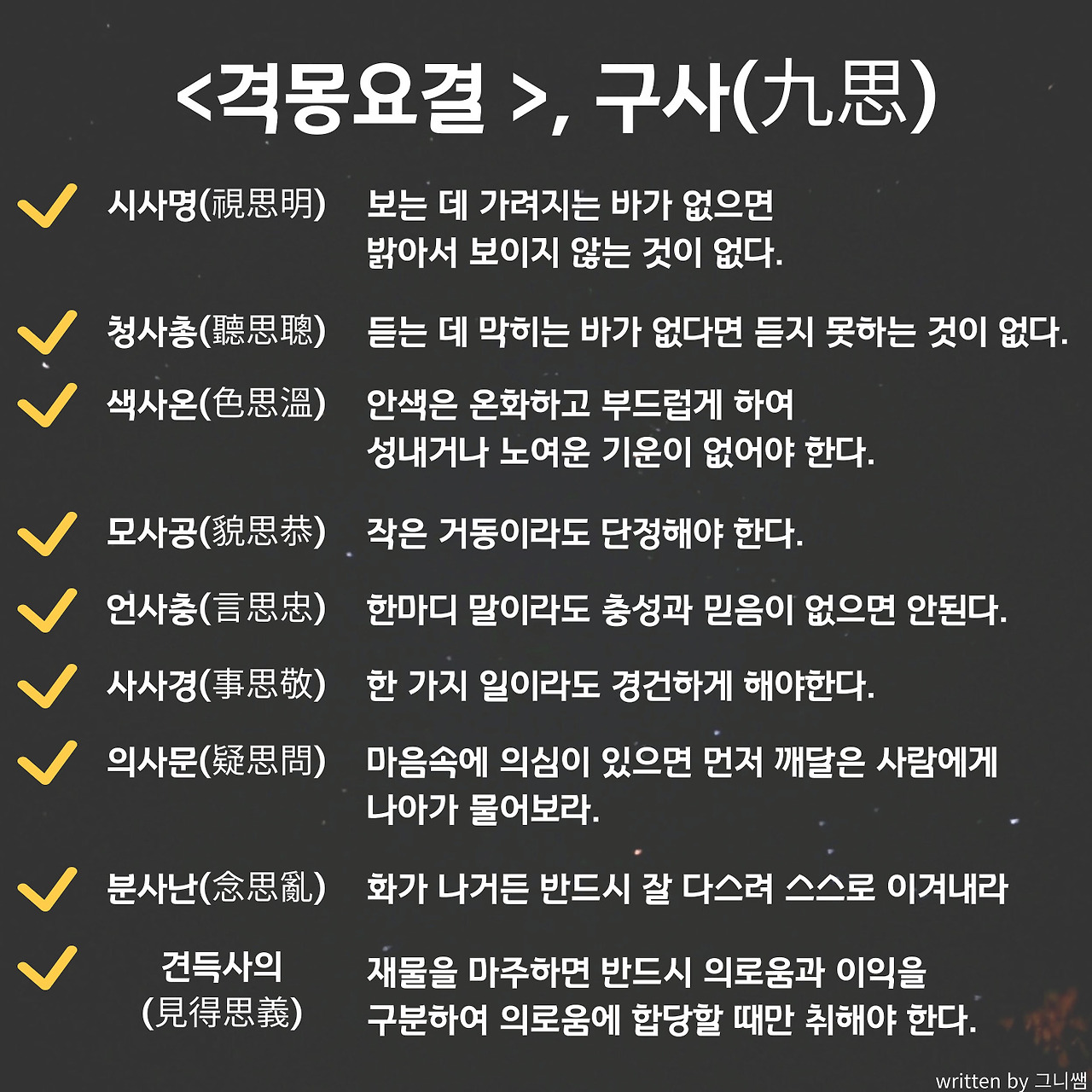 구용과 구사를 보면 사람이 너무 딱딱해 보이고 너무 고리타분한 이야기처럼 보인다. 그러나 현대에 나온 책들에서 하는 자세와 태도에 대한 이야기도 결국 다르지 않다고 생각한다. 모두 이렇게 해야 하는 것은 아닐지라도 우리의 평소 몸가짐에 대해 '어떤 몸가짐을 가지는 게 올바른 것인가'하는 시사점을 준다고 생각한다.