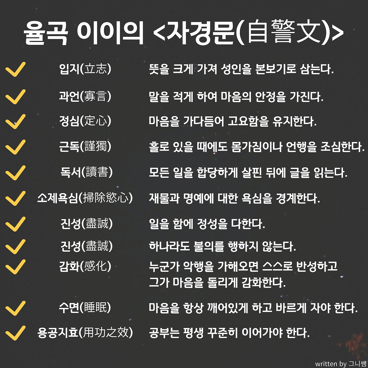 입지와 관련하여 율곡 선생께서 학문을 처음 시작하실 때 스스로 세운 목표를 알아두면 더 좋다. 자경문(自警文)이라는 글인데 스스로를 경계하는 뜻을 가진다. 자경문의 내용은 앞으로 소개할 구용, 구사 등 율곡 선생의 삶의 태도에도 지속적으로 드러난다.