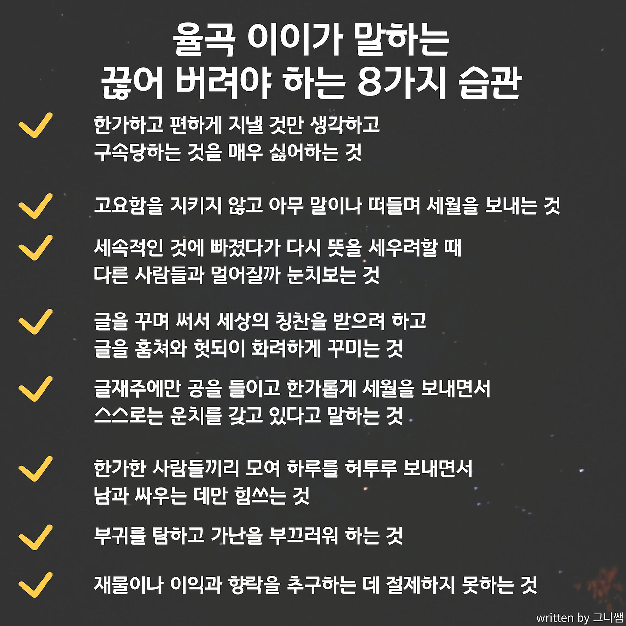 개인적으로 이 여덟 가지 악습을 보며 양심의 가책을 많이 느끼고 고치기 위해 많이 노력했다. 이 여덟 가지 습관은 현대에 사는 우리에게도 큰 만약 조선시대에도 유튜브와 SNS가 있었다면 '자기 전에 유튜브, SNS보지 않기'가 추가되지 않았을까? 이때 율곡이 강조하는 것은 자신이 고쳐야 할 습관을 '단번에' 뿌리 뽑아야 한다는 점이다.그렇지 않으면 아침에 뜻을 세우고도 저녁에 반복하느라 다시 헛되이 시간을 보낸다고 강조한다.