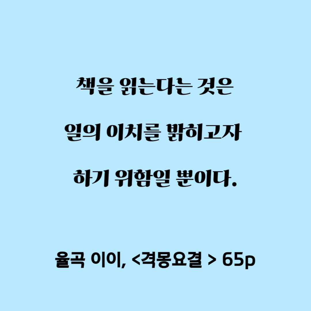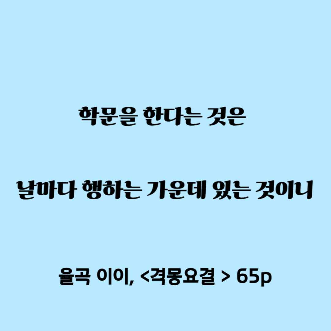 격몽요결은 무언가를 결심하기 전 최고의 동기부여 책이다. 격몽요결의 한마디 한마디는 정말로 나를 깨워주었다. 격몽요결에서는 특히 율곡선생의 실용적인 관점이 잘 드러난다. 율곡의 실용적 면모는 격몽요결 곳곳에 그대로 드러난다. 특히 격몽요결의 서문에 나오는 첫 번째 구절에서