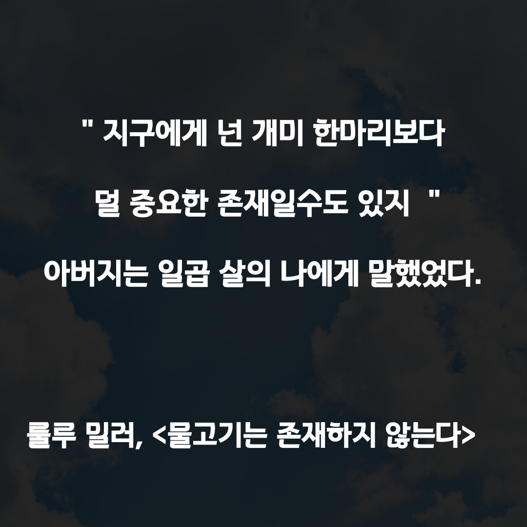 앞으로 내 기억 속에 물고기를 계속 떠올려야겠다. 아니, '어류'를 떠올리는 게 맞을 것 같다. 형식에 고착되고 창의성을 잃을 때, 삶의 방향을 잃었을 때 물고기를 떠올리면 나의 언행과 사상을 다시 한번 검토할 수 있지 않을까.