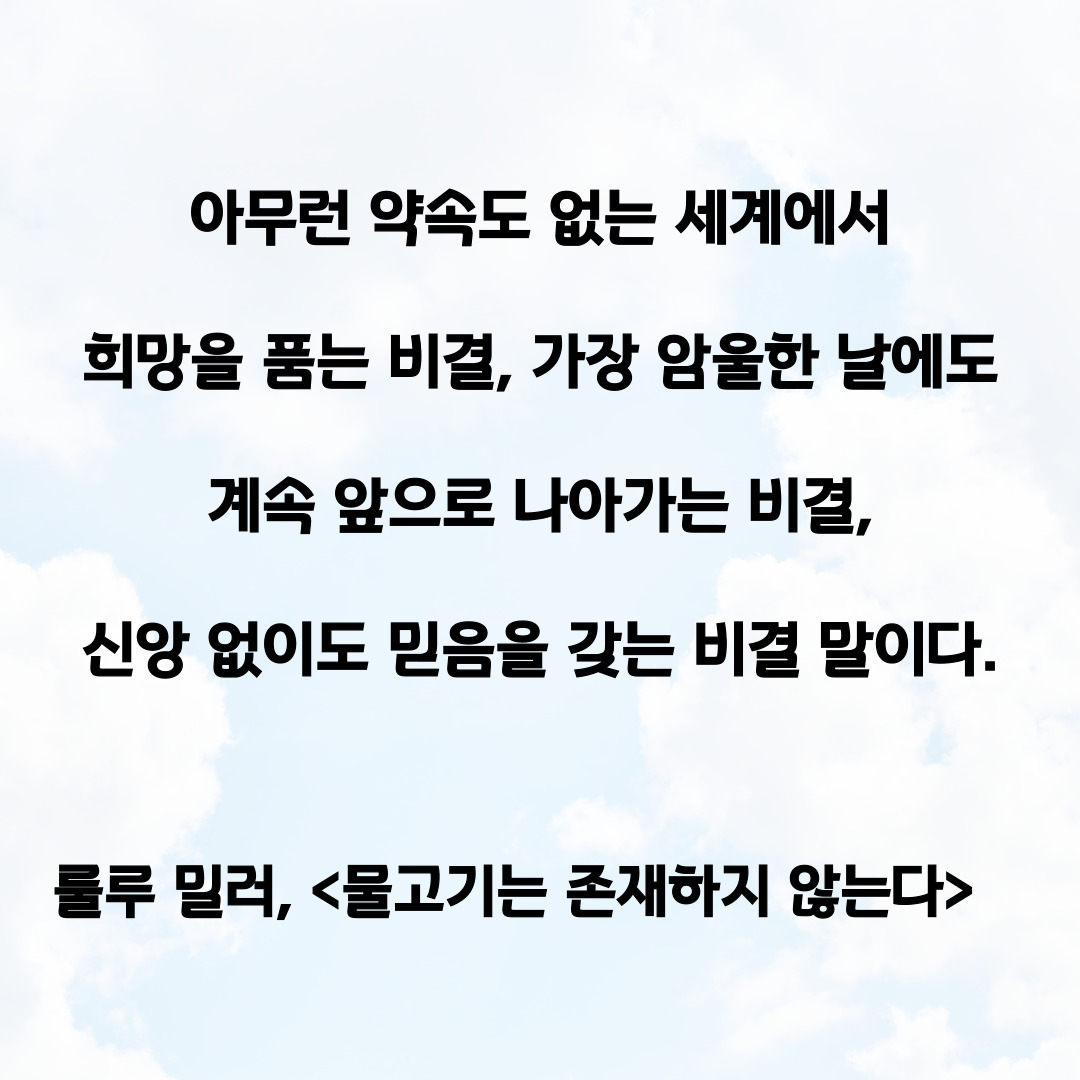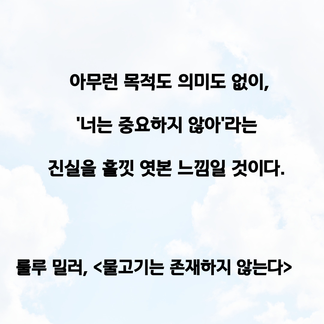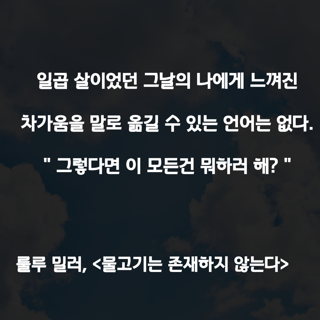 작가의 자아 찾기 여행이 중간에 끝나지 않고, 어류를 없애면서 자신의 의미를 찾으면서 끝난 점이 인상 깊다. 무엇이 되었든 그 의미를 찾아 혼자 떠난 여행의 과정이 흥미로웠다. 그러나 그녀는 언젠가 또 다른 의미를 찾으러 떠나겠지?