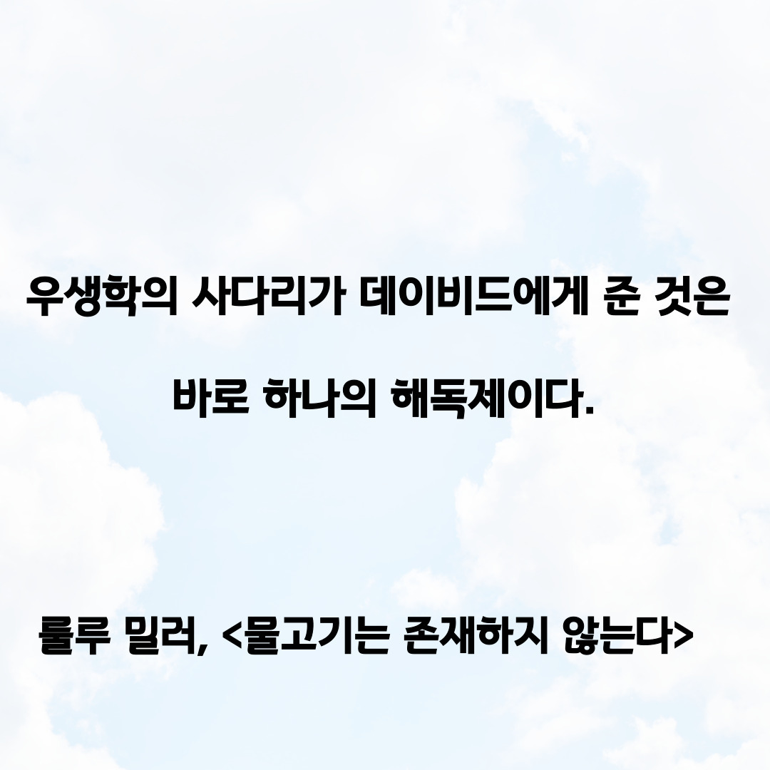 '물고기는 존재하지 않는다'의 작가는 데이비드와는 다른 지점에서 삶의 의미를 찾아냈다. 작가는 평등주의, 민주주의 등에서 삶의 의미를 찾았다. 그렇다면 우생학처럼 진화론, 평등, 민주주의 등 우리가 바람직하다고 믿는 가치들이 아닌 삶의 의미는 아예 싹을 잘라야 하는가?