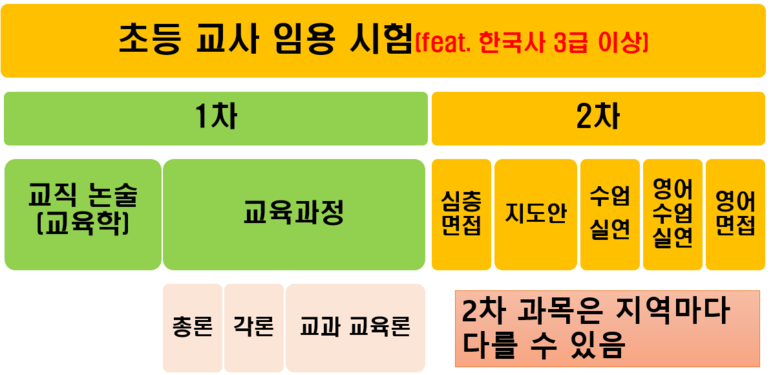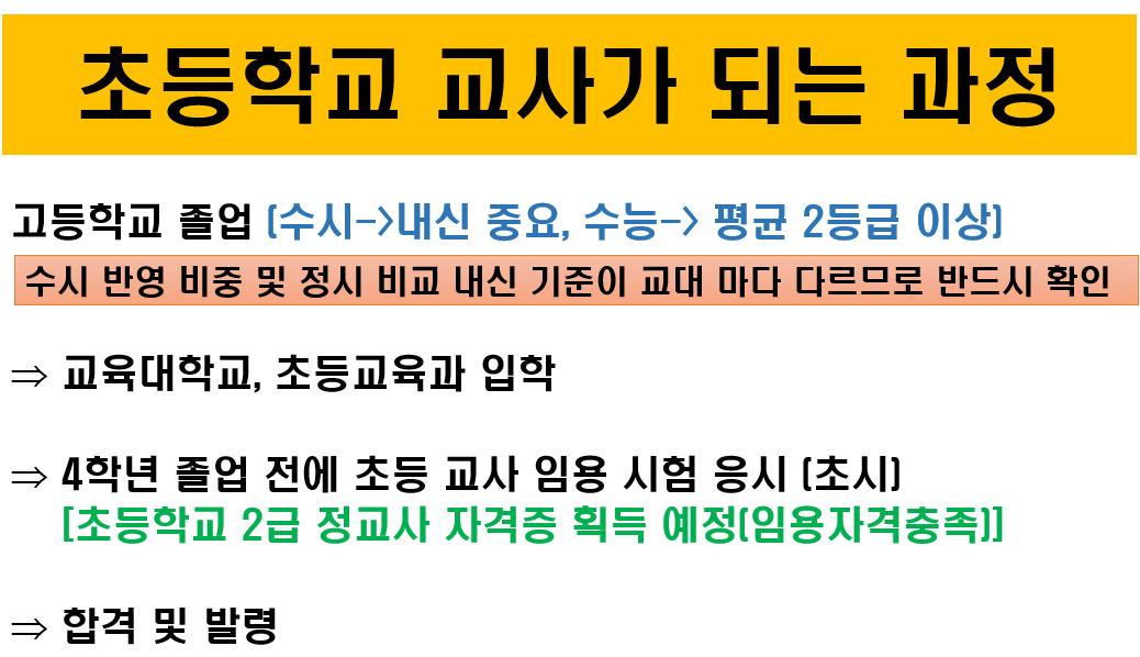 초등교사로서 정식 발령을 받기 위해서는 위에서 이야기 한 임용고시에 합격해야 한다. 이 시험은 초등 교원 2급 자격증이 있거나, 교육대학교 졸업예정자만 응시할 수 있다. 최근에는 교육대학교 졸업을 하기 위해서 교육학과목에서 일정 점수를 넘어야만 한다. 임용고시는 보통 1차, 2차로 나뉜다. 아래 로드맵을 보면 쉽게 이해할 수 있다.