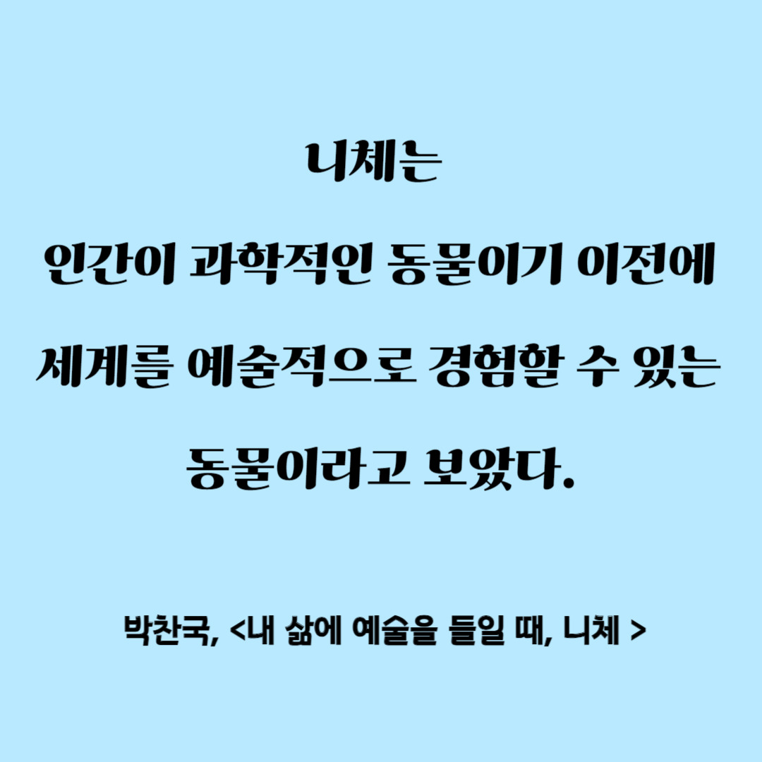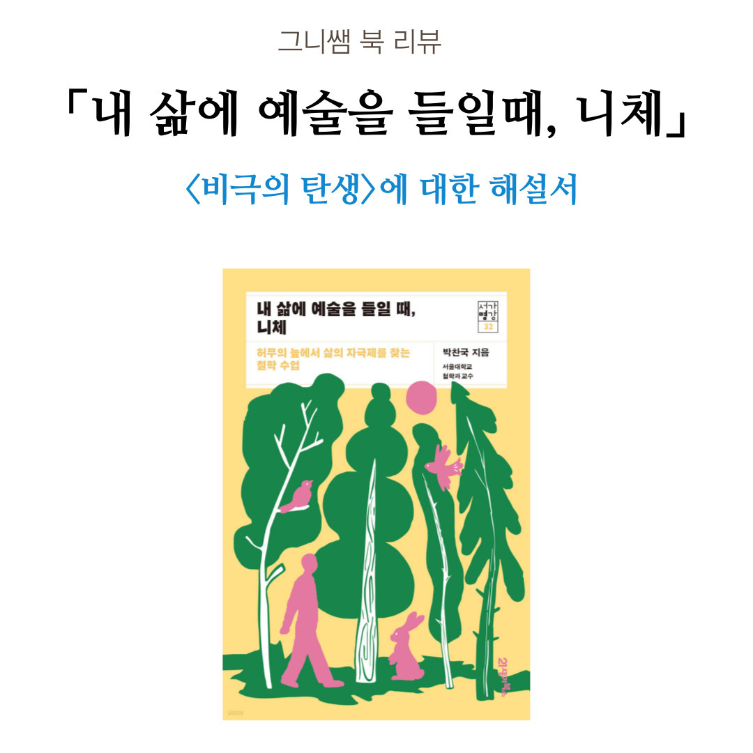 책에 나온 니체의 사상을 다 설명하자면 몇 권의 소논문이 나올 지경이라 여기서 마칠 수밖에 없다. 이 글의 목적은 책을 소개하는 것이기 때문이다. <내 삶에 예술을 들일 때, 니체>는 우리가 니체에 접근할 수 있는 가장 쉬우면서도, 니체의 근본적인 사상을 이해할 수 있는 책이다. 독자들은 이 책을 통해 니체의 예술관을 넘어 니체 사상의 전체를 관통하는 근본 사상에 대해 이해하진 못하더라도 '왜 니체가 그런 말들을 했는지' 문제의식에 대해 공감할 수 있는 좋은 기회를 얻을 수 있다. 그리고 니체를 입문하는 많은 사람들이 단지 그의 첫 작품이라는 이유로 제일 처음 <비극의 탄생>을 읽는 경우가 많다. 하지만 니체의 여느 저작이 그러하듯 <비극의 탄생>은 친절한 책이 아니다. 니체 자신도 도취에 빠져서 썼다는 생각이 들 정도로 논리성이나 설명이 없다시피 하다. 따라서 이 책은 그 난해한 비극의 탄생을 해설하는 해설서로서의 역할도 충실히 할 수 있는 좋은 책이다. #실존주의, #니체, #쇼펜하우어, #바그너, #비극의 탄생, #니체의 예술 철학에 관심이 있는 독자는 무조건 돈 주고 사서 여러 번 읽어보길 추천한다.