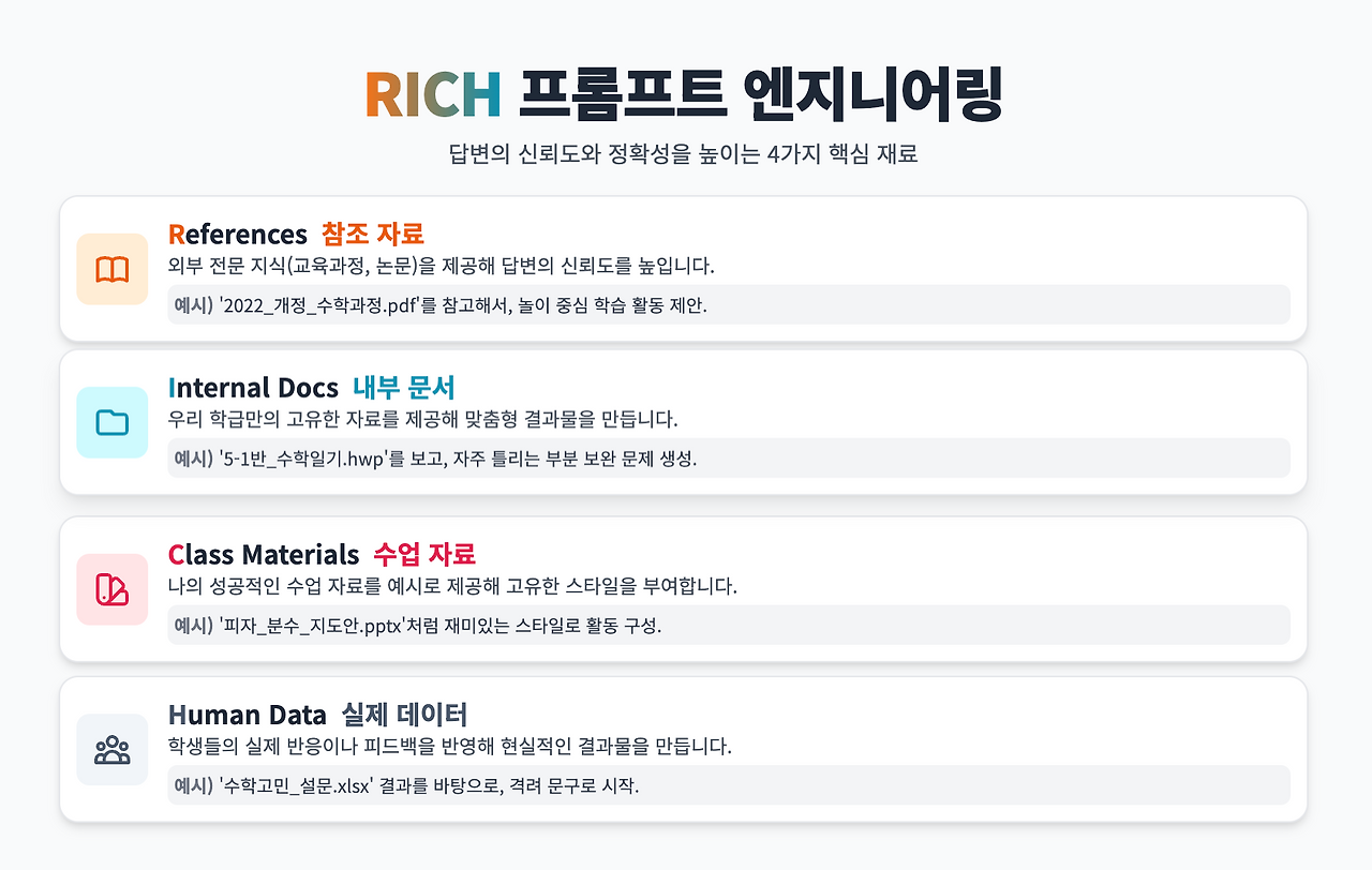 쉽게 말해 컨텍스트 엔지니어링은 제가 왜 이런 질문을 하는지, 어떤 배경지식을 가지고 있는지를 AI와 공유하는 과정이라고 생각하시면 됩니다. 연간 수업 계획서, 교과서, 지도서, 교육과정 문서, 공문 등 다양한 자료가 컨텍스트 자료가 될 수 있습니다.