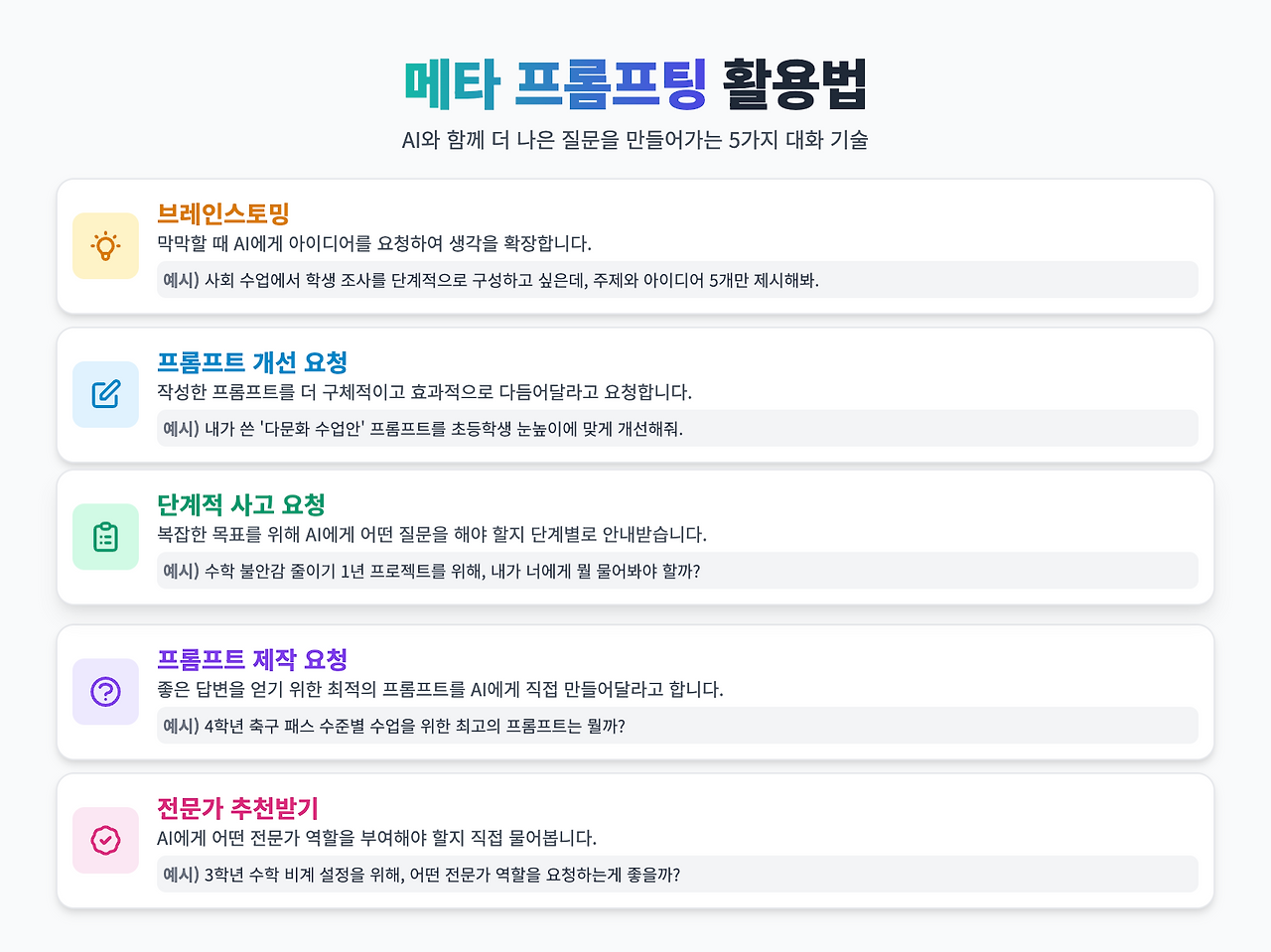 AI에게 질문하는 과정은 곧 나 자신에게 질문하는 과정입니다. 따라서 훌륭한 프롬프트는 나의 교육적 의도를 명료하게 만드는 데 진정한 가치가 있습니다.