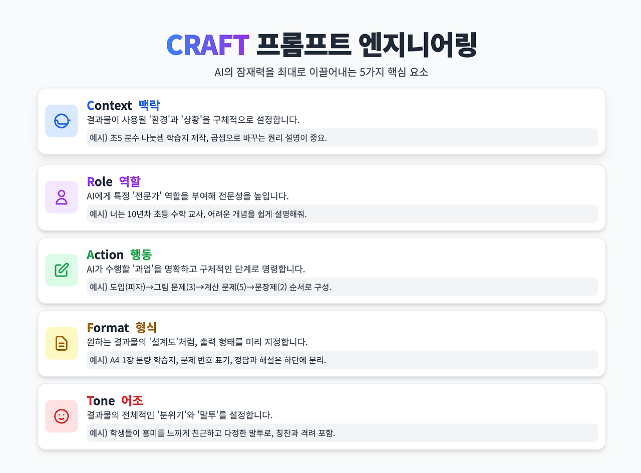 지금까지 제가 배운 내용들을 종합하여, 좋은 프롬프트를 구성하는 5가지 핵심 요소를 쉽게 기억할 수 있도록 CRAFT 프롬프팅 기법을 만들었습니다. 마치 장인이 작품을 정교하게 '만들어간다(CRAFT)'는 의미를 담아, 프롬프트를 체계적으로 설계하는 방법을 제시합니다.