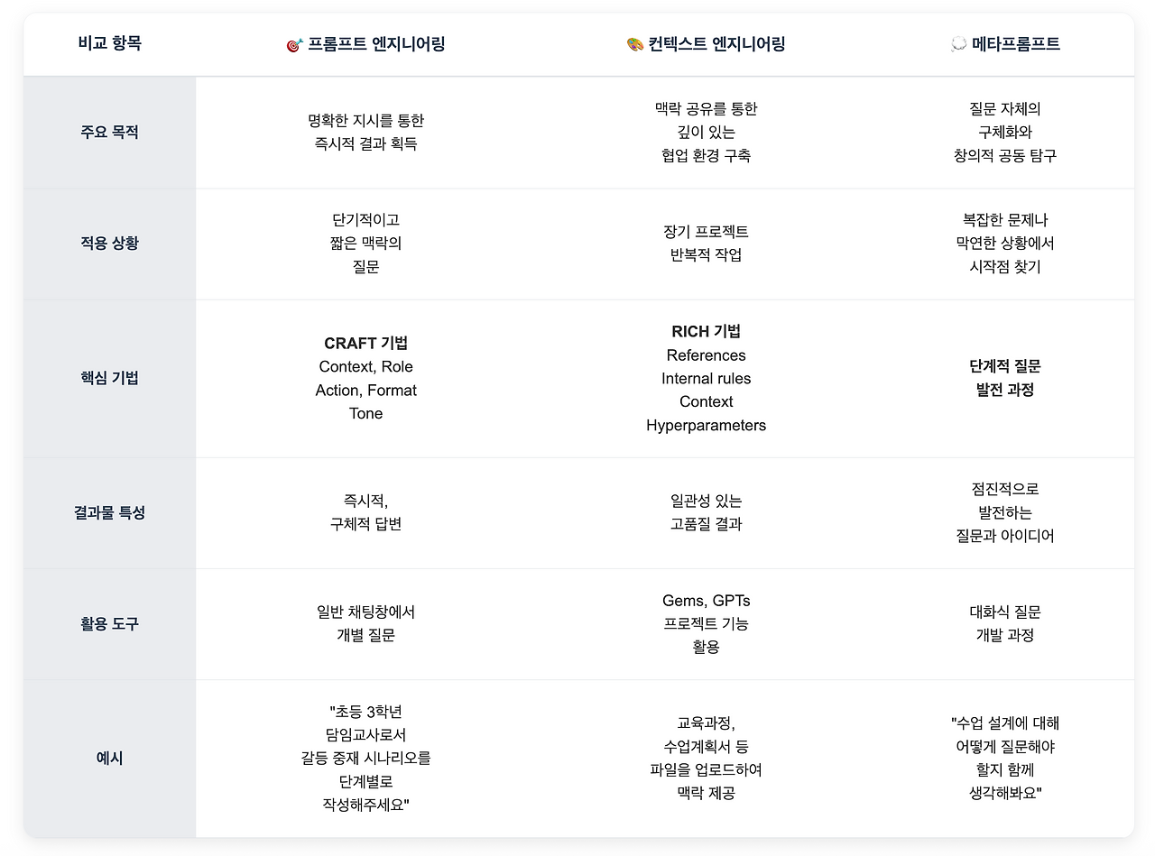 프롬프트 엔지니어링이 AI에게 일을 시키는 기술이라면, 콘텍스트 엔지니어링은 함께 일하는 환경을 만드는 기술이며, 메타 프롬프팅은 함께 성장하는 관계를 맺는 기술입니다.