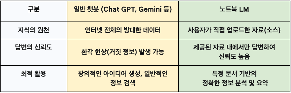 노트북 LM의 가장 큰 특징이자 장점은 '내가 제시한 자료(Source)에만 기반하여 답변한다'는 점입니다. 인터넷의 방대한 정보가 아닌, 선생님께서 직접 검증하고 업로드한 자료 안에서만 생각하고 답하기 때문에, AI의 '환각 현상'을 원천적으로 차단하는 '믿음직한 AI'라고 할 수 있습니다. 다음은 일반 LLM모델들과 NotebookLM의 차이점을 비교해 둔 표입니다.