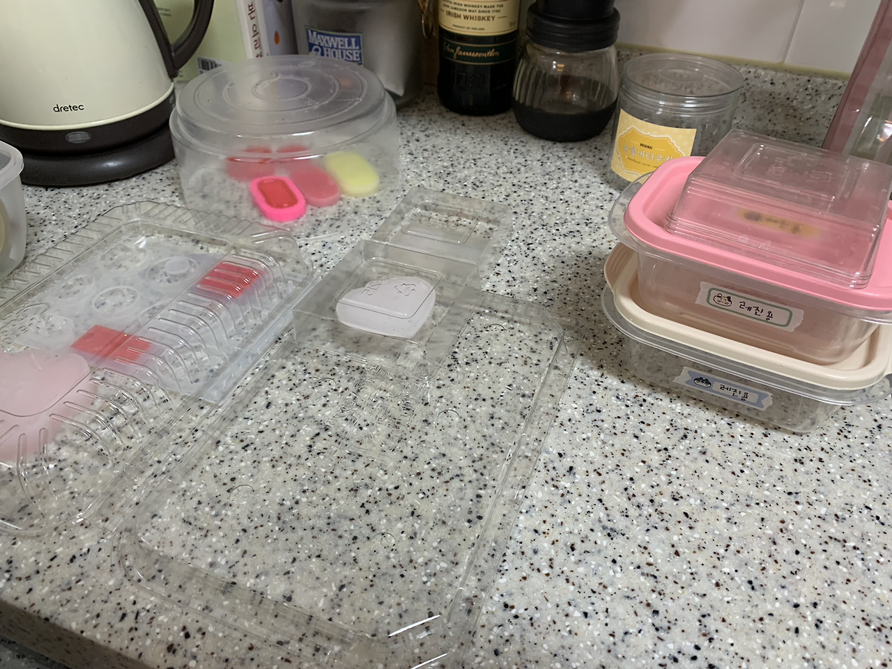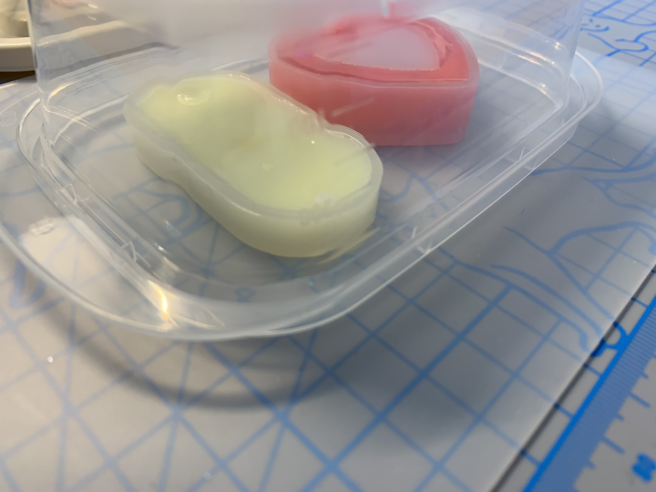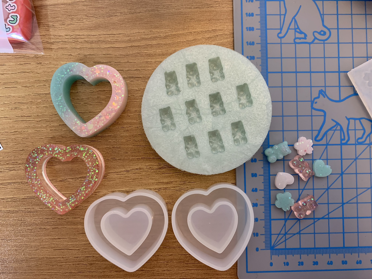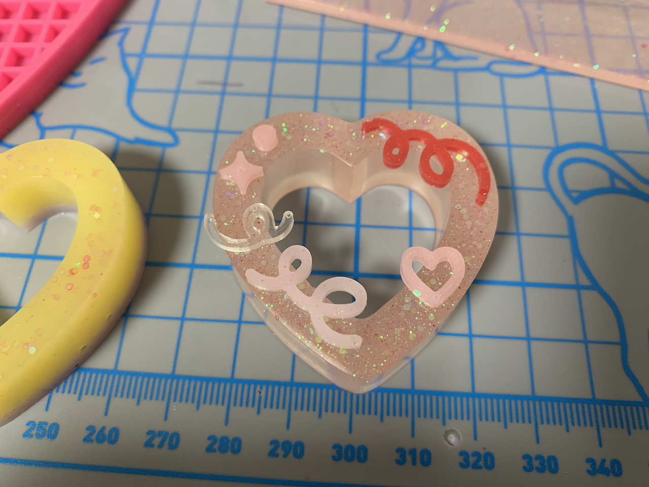 교반한 레진에 조색제를 넣어 색을 내고, 글리터까지 넣어 화려함을 더했다면 몰드에 부어 굳힌다. 기본적으로 레진은 굳으면서 열을 내기 때문에 실리콘 몰드도 영구히 사용할 수는 없다고 하나, 판매할 상품이 아니므로 나는 그냥 해지고 구멍 날 때까지 쓴다. 굳는 데 걸리는 시간은 최소 3시간에서 48시간, 최대 72시간까지도 걸린다. 이 시간이 가장 고되고 힘들다.