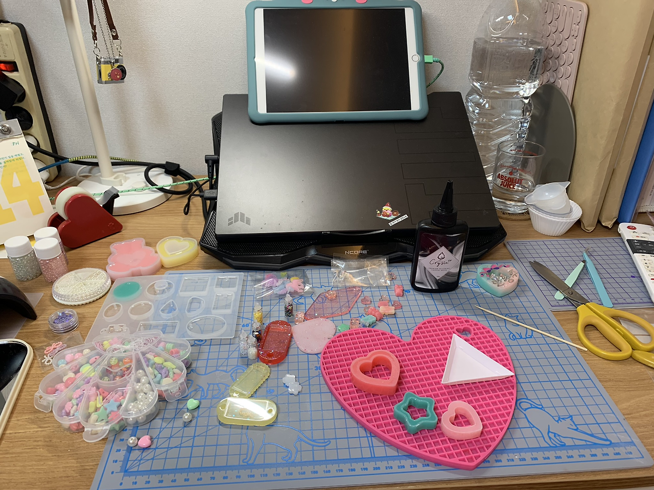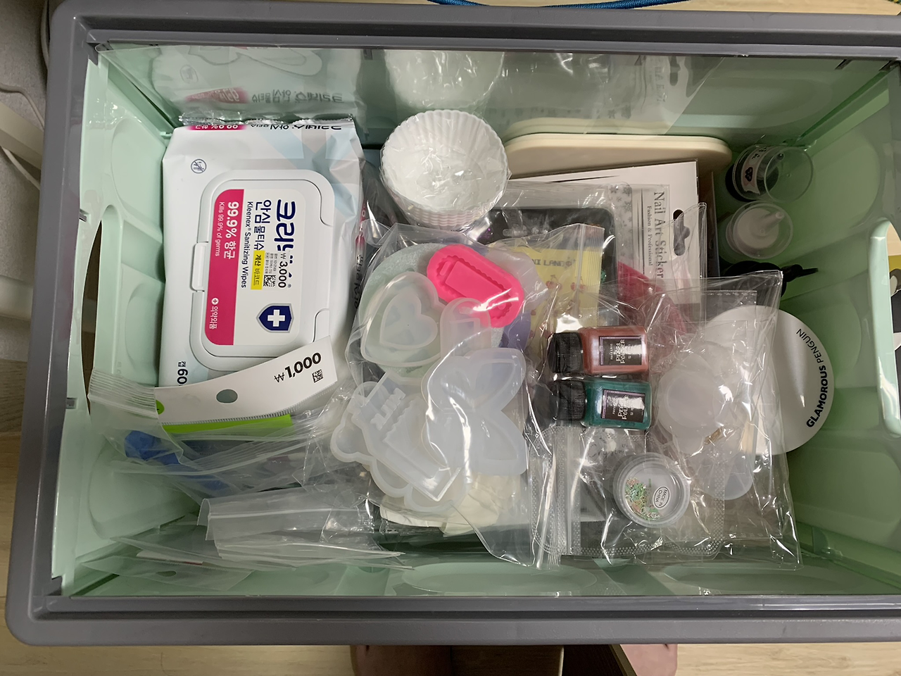 레진 아트의 시작은 돈, 그리고 시간이다. 초기에 투자해야 하는 자본의 규모가 큰 편이고 내가 경험한 다른 어떤 취미보다도 시간이 많이 들었다. 일단 레진이 필요하다. 용량에 비해 가격이 비싸고 당연하게도 비쌀수록 좋다. 레진과 더불어 반드시 필요한 것은 몰드. 액체 상태의 레진을 틀에 부어 굳히고 모양을 만들어야 하기 때문에 몰드가 있어야 한다. 일부 작가들은 이 몰드를 직접 만들기도 하지만 몰드 제작은 완전히 차원이 다른 고수들의 영역이다. 플라스틱은 녹아 버리므로 쓸 수 없고 열에 잘 견디는 실리콘 재질이어야 한다. 그리고 레진 교반(섞기)을 위한 용기와 용액을 젓기 위한 막대가 필요하다. 레진은 액체 상태인 주제와 경화제가 섞이면서 열을 내며 굳어지는데 이 과정에서 인체에 유해한 유기 증기가 발생한다고 하므로 장갑과 마스크, 보안경까지 갖추는 것이 좋다. 꼭 필요한 것만 해도 이 정도다. 예쁜 색을 내기 위한 조색제, 반짝임을 더하기 위한 글리터, 장식을 위한 스티커 등은 선택이지만 부자재는 무조건 많으면 많을수록 좋다.