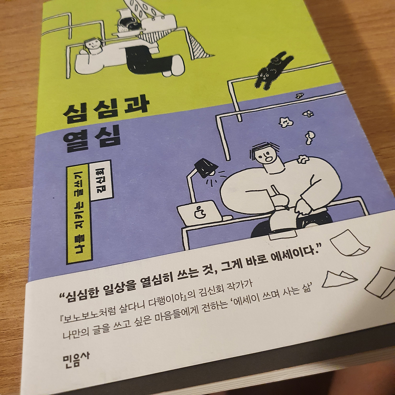 다음으로 고른 책은 김신회 작가의 <심심과 열심>이라는 에세이 쓰기에 관한 책. '심심한 일상을 열심히 쓰는 것, 그게 바로 에세이다'라는 띠지에 적힌 글귀가 마음에 들었다. '별 것 없어 보이는 내 일상을 굳이 글로 쓸 필요가 있으려나.' 글쓰기의 존재론적 회의가 펄펄 끓어 넘치려는 타이밍에 냄비 뚜껑 열듯 회의감을 가라앉혀주는 적절한 글귀였다. 또 작가는 '요즈음 에세이는 개나 소나 쓴다'는 비아냥을 '개나 소나 쓸 수 있는 게 에세이의 매력이다'라는 뜻으로 해석해낸다. 에세이 만세를 외친다. 개나 소나 나나 다 쓸 수 있는 거라니! 개나 소와 자웅을 겨루는 내게 용기를 북돋아 준다.