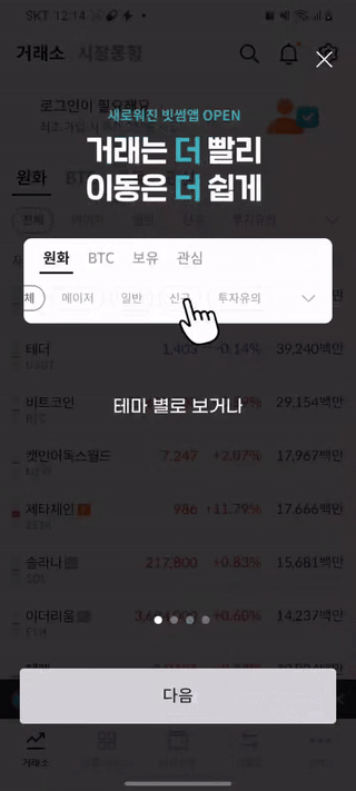 거래소에서 취급하는 코인의 유형을 업비트에 비해 상세하게 필터링했습니다. 관심 있는 코인의 테마별로 조회할 수 있습니다. 업비트는 상단 메뉴를 거래소/NFT로 구성한 반면 빗썸은 거래소/시장동향으로 구성했습니다. 가상화폐 아이템에 보다 집중하고, 관련 정보 쉽게 접근할 수 있도록 제공해 리텐션과 앱 사용시간 확대가 목표로 보입니다.