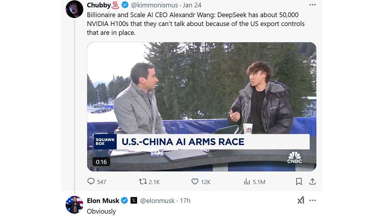 일론 머스크는 SNS 엑스에서 딥시크가 표면적으로 밝힌 것보다 엔비디아의 비싼 최신 칩 'H100'을 대량 보유한다는 게시글을 공유했습니다.