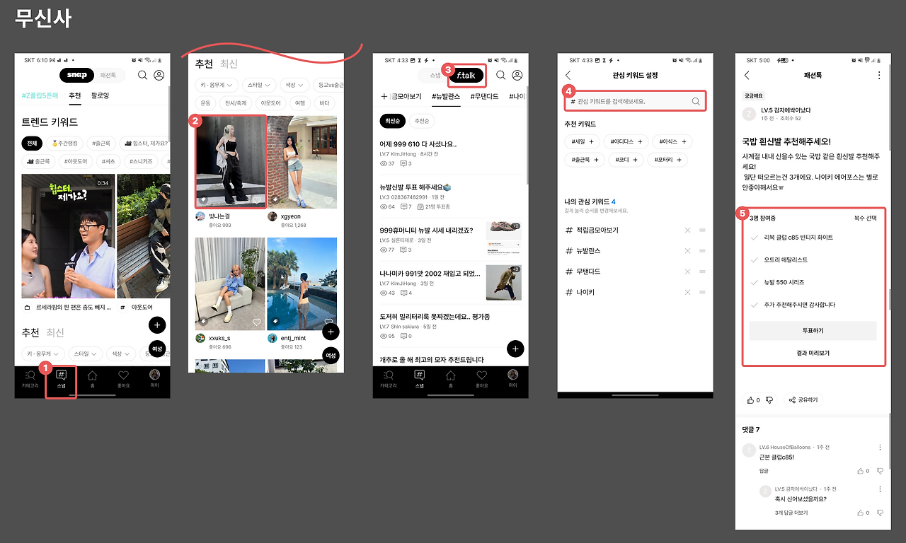 (2)키워드로 스타일을 필터링 해 사용자들의 스냅사진을 모아볼 수 있고, 착용 상품을 알 수 있어요. (3)2023년 4월에는 패션톡을 오픈해 커뮤니티성을 강화시켰어요. (4)관심 키워드를 세부적으로 설정해서 사용자가 관심있는 상품에 대해서만 소통할 수 있어요. (5) 투표기능, 댓글, 관련 talk들 등 다양한 형태의 소통 도구들을 함께 제공하고 있어요.