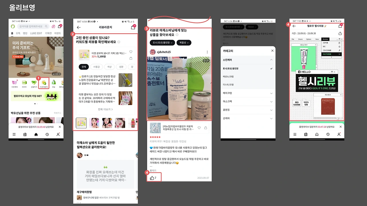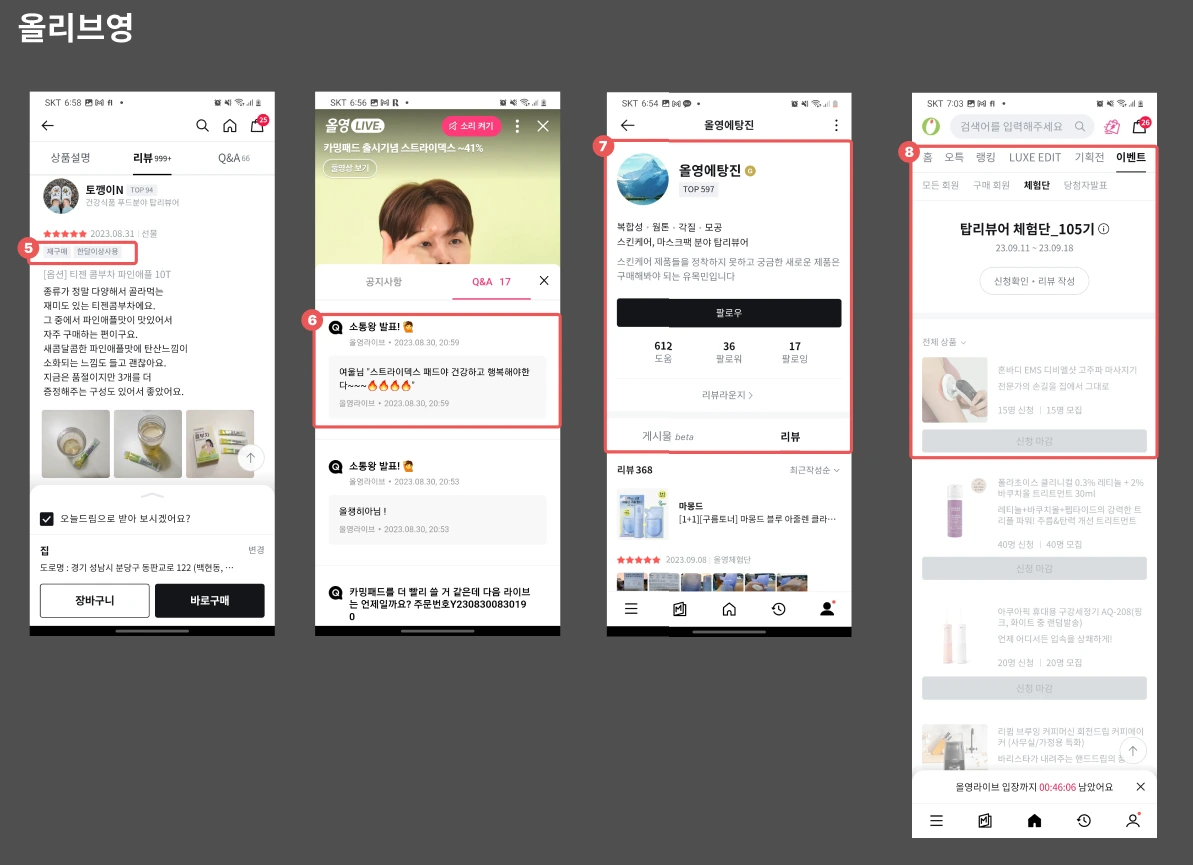 (5) 리뷰에 재구매/한달이상과 같은 키워드를 제공해 리뷰의 신뢰성과 유용성을 높였어요. 보다 디테일한 리뷰를 제공해 궁금한점을 해결할 수 있도록 했어요. (6) 올리브영의 쇼핑 라이브 '올영라' 안에서는 QnA를 제공해 소비자와 판매자가 실시간으로 소통할 수 있게 했어요. (7) 리뷰 작성자들을 팔로우하고 리뷰를 모아볼 수 있도록 한 것도 눈에띄는 특징이에요. (8) 탑리뷰언서인 top 1000명에게는 탑 리뷰언서 뱃지를 달아 월 2회라는 무료 체험이라는 보상을 주며 고퀄리티의 리뷰가 생산되도록 했어요.