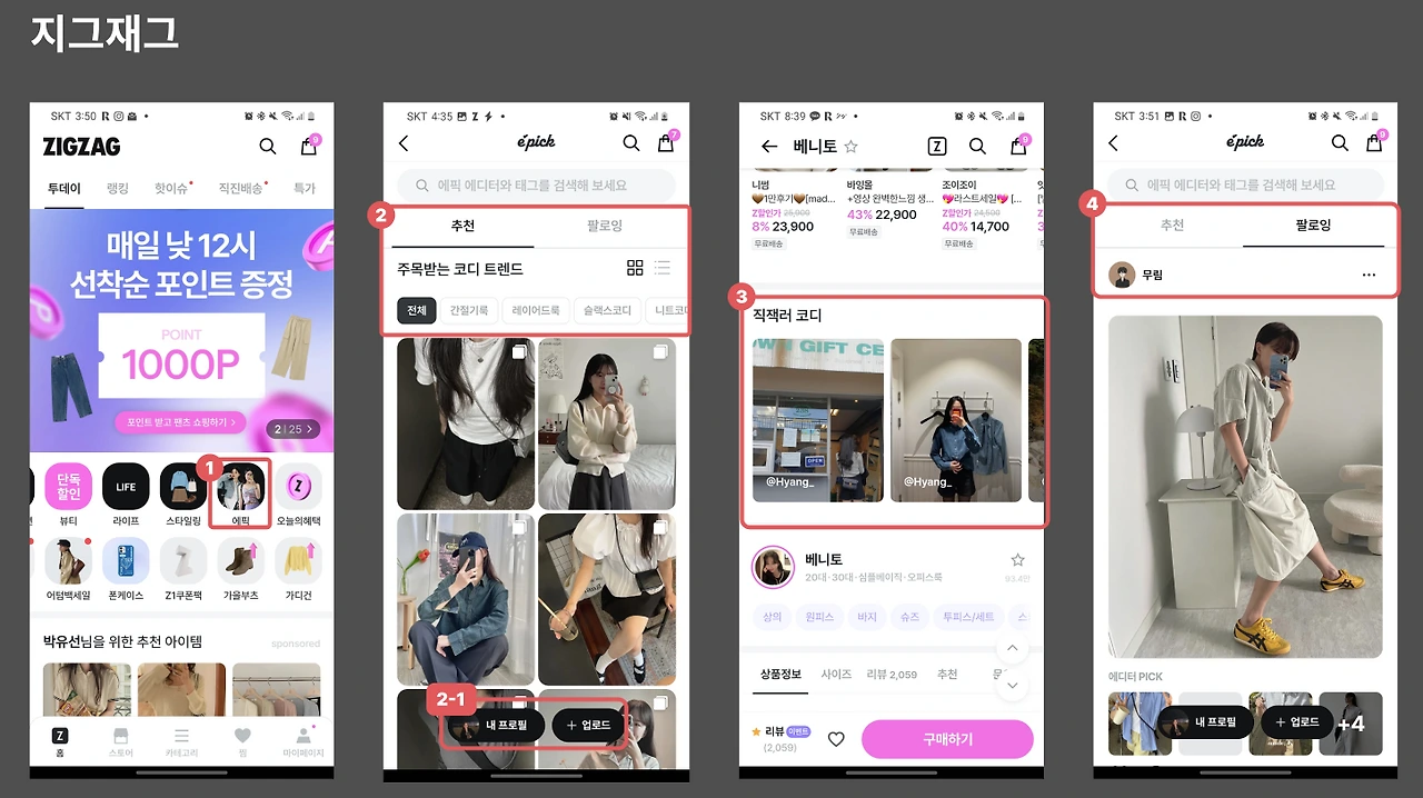 (1) 지그재그는 메인 퀵 버튼으로 커뮤니티 구간인 "에픽" 서비스를 위치시켰어요. 아직 소규모이고, 커머스 광고 영역이 보다 크게 자리잡고 있기 때문에 주요 서비스는 아니에요. (2) 계절, 트렌드에 따라 키워드를 상단에 배치하고 해당 키워드 관련 유저들의 코디 샷을 볼 수 있도록 했어요. 쉬운 업로드를 위해 (2-1) 코디샷인 "에픽" 업데이트 버튼을 플로팅으로 제공해요. (3) 상품 상세화면에서 해당 제품의 에픽 코디샷이 나오도록 해 다양한 착용 사진들이 보이도록 구성했어요. (4) 타 서비스들과 같이 내가 팔로우 한 유저들의 착용샷만 모아 볼 수 있어요