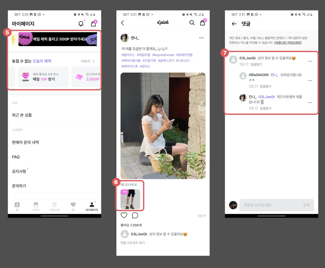 (5) 지그재그는 많은 업로드를 위해 에픽 코디샷 한개당 500p를 제공해요. 보상이 꽤나 크죠? 그만큼 고퀄리티의 사진을 위해 업로드 권한 심사를 거쳐요. 서비스 활성화를 위해서 좋아요는 3개당 10p를 모든 사용자에게 제공해요. (6) 에픽 코디샷을 구경하며 사진상의 지그재그 제품으로 빠르게 이동할 수 있어요. (7) 해당 게시물 게시자와 댓글로도 소통할 수 있게 해 궁금한점을 빠르게 묻고 답변 받을 수 있어요.