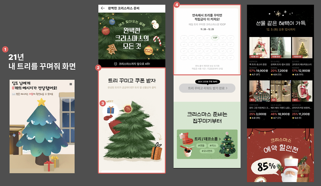 21년도를 뜨겁게 달궜던 서비스, (1) 내 트리를 꾸며줘, 기억나시나요? 사용자가 각자의 트리를 만들고 링크를 공유해 편지를 남기고는 했는데요. (2)아이디어스도 트리를 꾸미는 이벤트를 열었어요. 앱에 출석해서 자신의 트리를 꾸미고 적립금을 받을 수 있고, 다음날의 오너먼트를 보여주며 매일 앱에 들어오도록 유도해요. 이벤트 페이지 하단에는 포인트를 활용해 구매할 수 있는 연말 상품들을 모아서 보여주고 있어요.