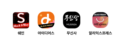 스마트폰에서 제일 처음 맞이하는 런처아이콘부터 블랙 프라이데이, 연말을 맞이해 새 단장한 모습을 살펴볼 수 있어요. 쉐인, 아이디어스처럼 띠 배너를 추가하는 형태가 있다면 무신사는 자사 로고보다 '무진장' 블랙프라이데이를 더욱 크게 내세워 홍보하고 있다는 점이 눈에 띄어요. 알리익스프레스도 앱 런처 컬러를 블랙 프라이데이에 맞춰 큰 변화를 줬어요. 이렇게 런처를 이벤트 기간에 맞춰 변경해 줄 때 다른 앱을 켜려고 둘러보다가도 런처 아이콘만 보고 '어,, 행사하고있나?' 생각이 절로 들게 한다는 데에 장점이 있어요.