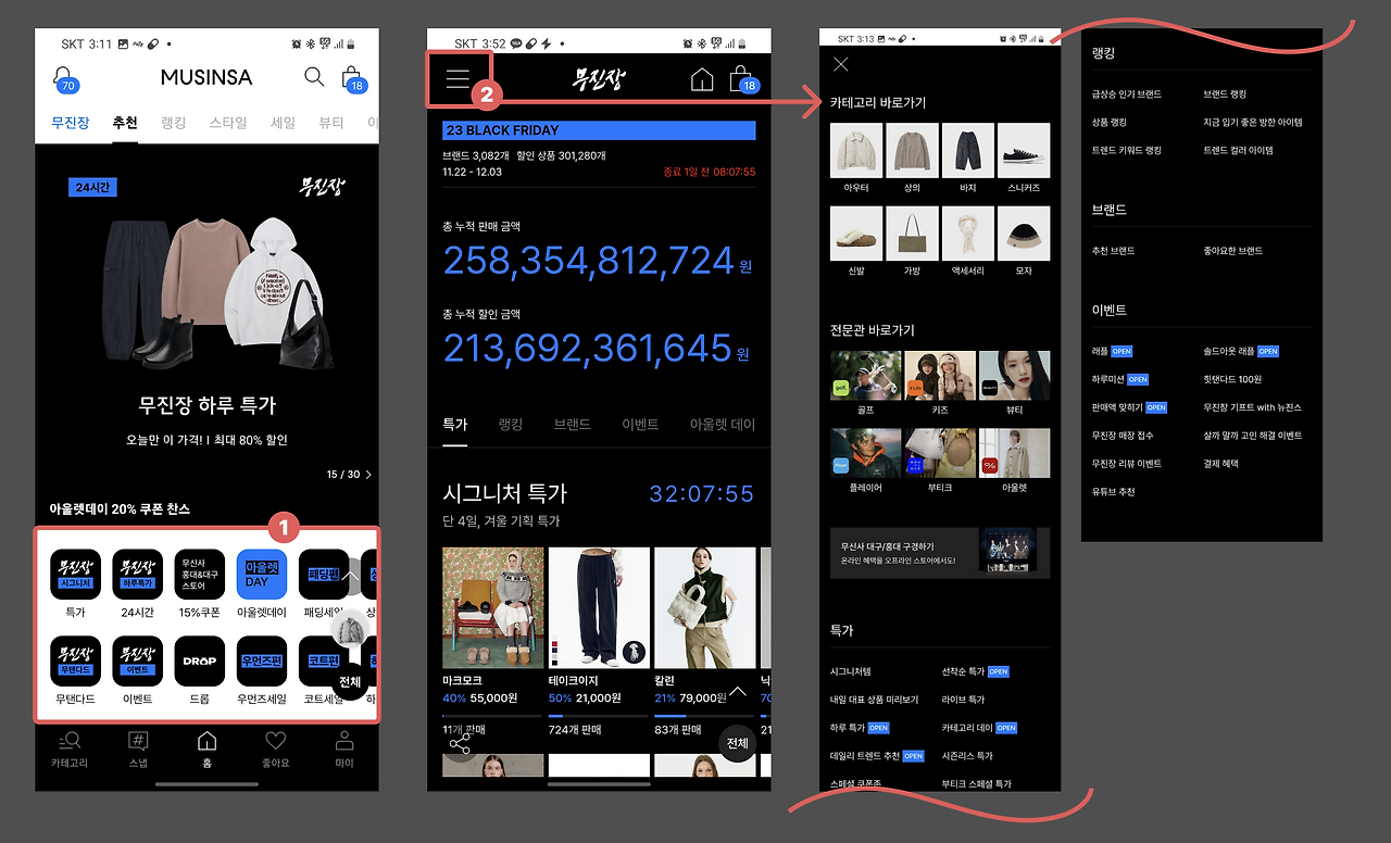 무신사는 '무진장'이라는 이벤트명으로 블랙 프라이데이를 진행했어요. 앱에 진입하면 메인화면이 아닌 무진장 이벤트 홈페이지를 먼저 노출시켜 무진장 이벤트를 사용자가 접할 수 밖에 없도록 했어요. 대대적인 이벤트인 만큼 이벤트 배너, 메인홈, 퀵버튼까지 모두 블랙+블루 컬러를 활용해 앱 전체가 블랙프라이데이 이벤트를 진행하고 있는 느낌을 강하게 전달했어요. 하나의 이벤트 페이지이지만, 방대한 스크롤과 탭의 구성으로 되어있어 (1)퀵버튼이나 이벤트 페이지 자체에도 (2)메뉴 버튼을 추가해 카테고리 별로 나누어 볼 수 있도록 했어요.