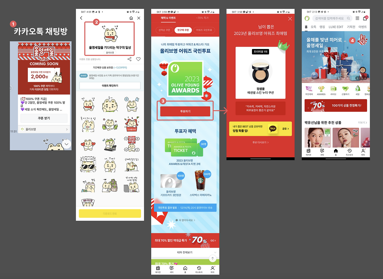 올해도 올리브영의 연말 세일은 어워즈와 함께 진행되는 모습을 볼 수 있었어요. 눈에띄는 점은 (1, 2) '올영 세일'을 홍보하는 이모티콘을 제작해 링크를 공유한 사용자에게 무료로 제공해요. 링크를 공유해 바이럴 시킬 뿐만 아니라, 이모티콘을 통해 거부감 없는 홍보로 이어지죠.