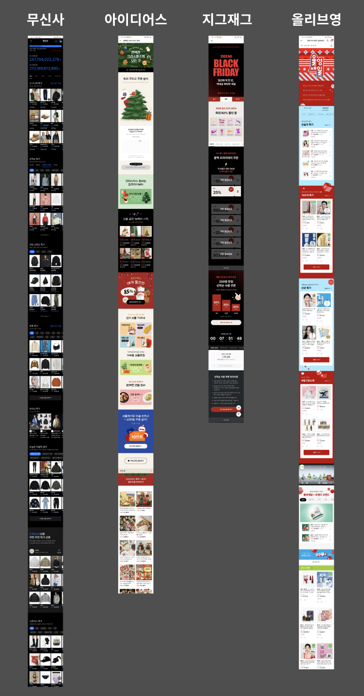 블랙 프라이데이, 연말 이벤트는 이커머스의 가장 중요한 행사인 만큼. 고객이 이탈하지 않도록 쭉쭉 스크롤 하며 끊임없이 상품을 탐험하게 만들고 있어요. 요즘 문득 스크롤 하다가 '어머! 맞아 이거 필요했었어.' 하지는 않았나요? 무신사와 올리브영은 스크린샷을 모두 다 담을 수 없을 정도로 긴 이벤트 페이지를 구성했어요. 주로 가격이 강점인 아이템들을 키워드별로 나누어 볼 수 있게 구성했어요.