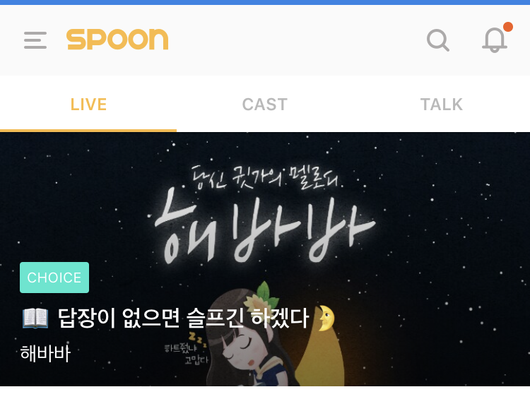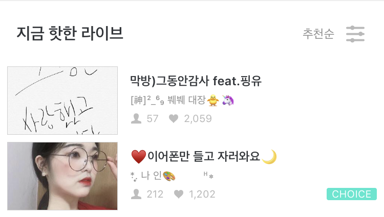 서비스 입장 시 첫 페이지는 서비스의 본질과도 연결되어 있어요. 스푼 라디오 같은 경우 첫 페이지가 지금 당장 라이브 방송을 하고 있는 BJ를 보여주고 있는 LIVE 페이지예요. 위에서 계속 강조해서 말하고 있던 Z세대들이 가지고 있는 즉시적인 소통을 LIVE 페이지에서 해결할 수 있어요. 페이지의 가장 상단에는 스푼 라디오에서 '수동 추천'을 해주고 있는 CHOICE라는 영역이 크게 자리하고 있어요. 지금 막 서비스를 시작한 사람들이 "어? 이건 뭐지?"하고 입장을 하고, 실력 있는 BJ의 오디오 콘텐츠를 소비하고 “어? 이거 괜찮은데?”라는 사용자 경험을 만드는데 큰 도움을 주고 있어요. 보통 최상단의 콘텐츠 같은 경우 알고리즘을 통해 자동적으로 제공해주기보다는 어드민 영역에서 수동으로 직접 콘텐츠를 확인해주고 노출하는 경우가 많아요. 클릭률이 가장 높은 영역에서 사용자들이 콘텐츠를 통해 긍정적인 경험을 할 수 있도록 수고로운 작업이라도 감수하는 거지요. 물론, 스푼 라디오가 CHOICE를 자동화 알고리즘으로 콘텐츠를 돌리고 있을 수도 있어요! 다만, 저의 경험을 바탕으로 짐작을 하자면 수동으로 직접 콘텐츠를 검수하고 노출하고 있는 것 같다고 말하는 것이니 참고만 해주세요 :)