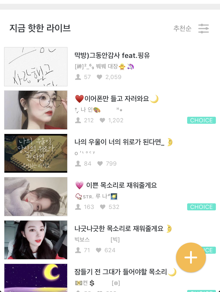 결론적으로 하고 싶은 이야기는 스푼 라디오가 수동 추천과 자동 추천을 조화롭게 사용하면서 지금 당장 방송을 하고 있는 인기 있는 BJ들을 정말 기가 막히게 추천해주고 있다는 사실! 더불어 LIVE 페이지라는 이름으로 추천 피드를 서비스의 첫 페이지로 제공하면서 ‘즉시적인 소통’이라는 Z세대의 욕구를 날카롭게 해결하고 있다는 거예요.