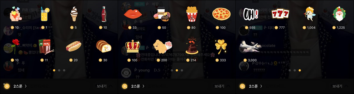 지금 보이는 이미지는 내가 좋아하는 DJ에게 선물할 수 있는 스푼의 종류에요. 하나의 스푼으로는 주스 스푼을 살 수 있고, 10개로는 콜라 스푼, 100개는 왕관 모양의 스푼을 구매할 수 있어요. 디테일하게 보면 위트가 느껴지는 부분이 있는데 바로 스푼의 숫자와 아이콘의 매칭이에요. 1,004개는 천사 모양의 스푼 그리고 1,225개는 산타 모양의 스푼으로 매칭을 시키면서 사용자에게 소소한 위트를 제공하고 있어요. 분명 이 글을 보면서 "그래서, 스푼 하나에 얼만데요...?"라고 생각하는 분들이 있겠지요? 그래서 지금 바로 말씀드리려고 해요! 스푼은 10개에 1,200원에 판매되고 있어요. 낱개로 판매를 하지는 않고 있지만 계산을 해보면 개당 120 원인 셈이에요.