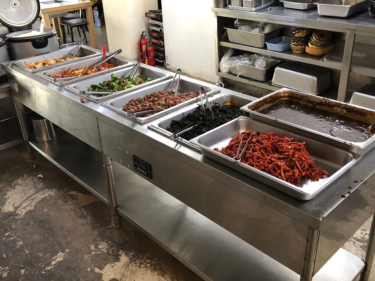 식당으로 들어가자 장부를 들고 있던 사장님이 내게 어디서 왔냐고 물었다. 서울에서 왔다고 답하니 사장님의 콧바람 소리가 들렸다. 알고 보니 식당 주위에 건설 현장들이 많아 소속 회사 이름을 장부에 올리고 먹는 사람들이 대부분이었다. 사장님은 서울 소속의 관광객 신분인 내게 식당 시스템에 대해 친절하게 설명해줬다. 일단 식당은 스스로 먹을 만큼만 음식을 덜어가는 한정식 뷔페고, 대충 둘러보고 적당한 자리에 앉아서 식사를 하면 된다고 했다. 한창 점심시간이라 식당에 빈자리가 많지 않았다. 그래도 사람들이 금방 식사를 하고 일어나서 5분 정도 기다리니 내가 원하는 구석진 곳에 자리가 생겼다. 식탁 아래 짐을 내려두고 음식을 가지러 갔다. 김이 모락모락 피어나는 흰쌀밥, 춘장 냄새가 진하게 퍼지는 짜장, 군침을 무한대로 만들어낸 된장국이 제일 먼저 눈에 들어왔다. 그 외에도 알타리 김치, 소시지 볶음, 시금치 무침 등 우리집 밥상의 오늘 점심 메뉴는 맛과 영양을 모두 갖추고 있었다. 설레는 마음으로 음식을 식판 위에 가지런히 담아 자리로 돌아갔다. 드디어, 짜장이 버무려진 흰쌀밥에 김치를 얹어 한 입 먹으려는 순간. 사람들이 수군대는 소리가 들렸다. 고개를 들고 보니 스무 명도 넘는 사람들이 식판만 들고 서 있었다. 나는 무슨 상황인지 몰라 일단 들었던 숟가락을 입으로 넣지도 못하고 식탁 위에 그대로 내렸다.