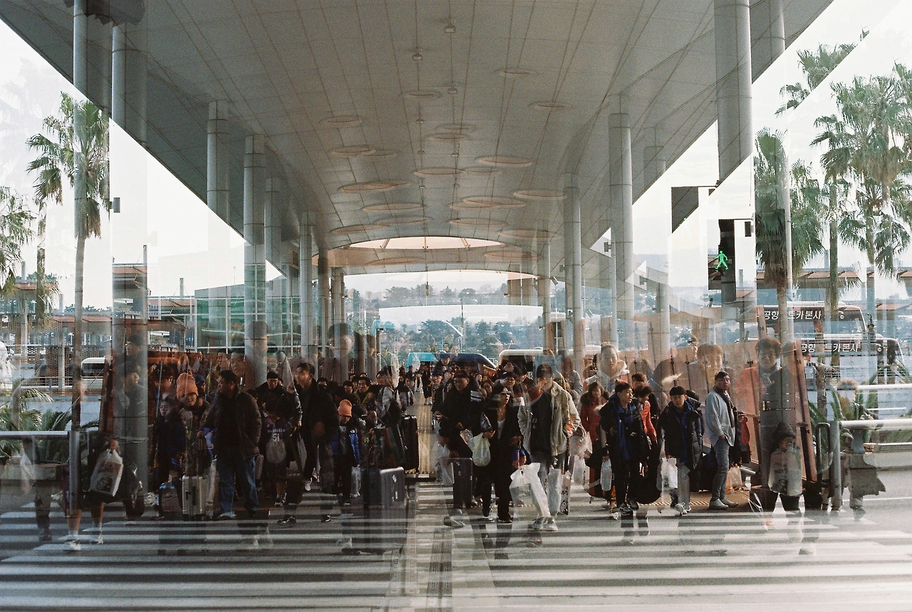만족스러운 바다 구경을 마치고, 차를 반납했다. 렌터카 업체에서 운영하는 셔틀버스를 타고 제주공항 주차장에서 내렸다. 제주공항으로 들어가기 위해선 신호등을 하나 건너야 했다. 신호가 바뀌기를 기다리고 있는데, 사람들의 표정이 눈에 보였다. 여행을 시작하는 사람들의 표정에는 설렘과 기대감이 묻어났다. 나처럼 여행을 끝내고 돌아가는 사람들의 표정에는 피곤함과 아쉬움이 묻어났다. 무엇이 불만인지 입이 뚱~하고 나온 사람도 있었고, 다시 일상으로 돌아가는 게 무서워 불안해 보이는 사람도 있었다. 가만히 서있기만 해도 신호가 바뀔 때마다 백 명이 넘는 새로운 사람들의 표정을 볼 수 있었다. 가만히 앉아있으면 새로운 초밥을 계속해주는 초밥처럼, '공항을 찾는 사람들'이라는 주제의 사진 작품들이 돌아가는 전시를 보는 것 같았다.