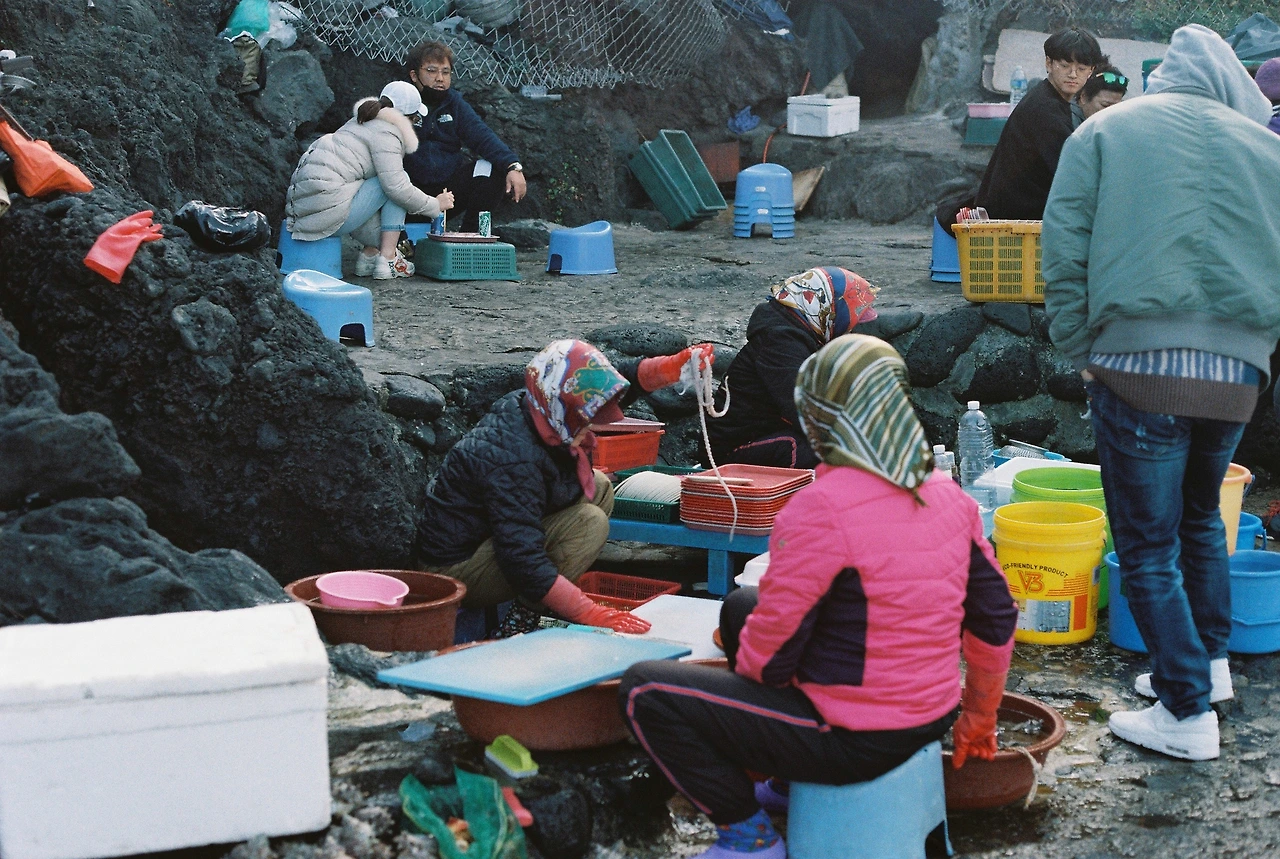 인터넷에선 하늘로 승천하는 용머리 모양의 용암 지형을 용두암이라고 부른다고 설명했다. 그러나 내 눈에는 용이 아니라 수면 위로 점프하는 고래처럼 보였다. 고래 주위로 튀어 오른 파도를 보면 고래가 얼마나 힘차게 뛰어올랐는지도 짐작할 수 있었다. 사람들은 용두암이라고 부르지만 나는 경(고래)두암이라고 부르고 싶었다. 솔직히 말하자면, 용두암에서 내 눈을 사로잡은 것은 용도 아니고, 고래도 아니고, 사람들이다. 용두암이 활력이 넘치는 이유는 용두암에 있는 사람들 덕분이었다. 절벽 밑에 있는 작은 동굴에서 해산물을 파는 할머니들이 보였다. 할머니들은 아궁이 하나를 두고, 주위에 옹기종기 앉아서 장사를 하고 있었다. 할머니들 앞에 있는 빨간색 세숫대야에는 해삼, 낙지, 멍게, 개불 등 주로 못생긴 해산물들이 보였다. 손님들이 주문을 하면 할머니들은 무심한 표정을 하곤 빨간색 고무장갑을 낀 손으로 현란하게 칼춤을 췄다. 비록 낙지 한마디에 3만원으로 엄청난 가격이지만, 할머니들의 퍼포먼스를 보기 위해 사람들은 줄을 서서 기다리고 있었다. 그중에는 바다에서 불어오는 바람, 파도가 바위에 부서지는 소리, 앉아만 있어도 힙업이 되는 목욕탕 의자를 위해 기다리는 사람도 있었을지도 모른다.